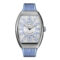 Vanguard Case. Stainless Steel. Hand polished. Water resistant up to 30 meters. Width: 32 mm x Length: 42.3 mm x Thickness: 9.9 mm. Light Blue inserts on both sides of the case. Sapphire crystal Hours, Minutes Winding shaft with 2 positions: 1.Marche. 2.Time setting MVT FM 1518-QZ. Quartz movement. Battery life of about 5 years. 40 Components. 5 Jewels. Width: 9.00 mm. Length: 15.55 mm. Thickness: 1.80 mm. Quartz frequency set at 32,768 alternations per hour Cotes de Geneve and circular graining on the casing ring. 24k Gold finish on the written engravings and rhodium plating Hand sewn alligator strap Stainless steel buckle. Hand polished Stamped guilloche with sun pattern. 20 Layers of translucent lacquer. Applique numerals meticulously painted and applied by hand