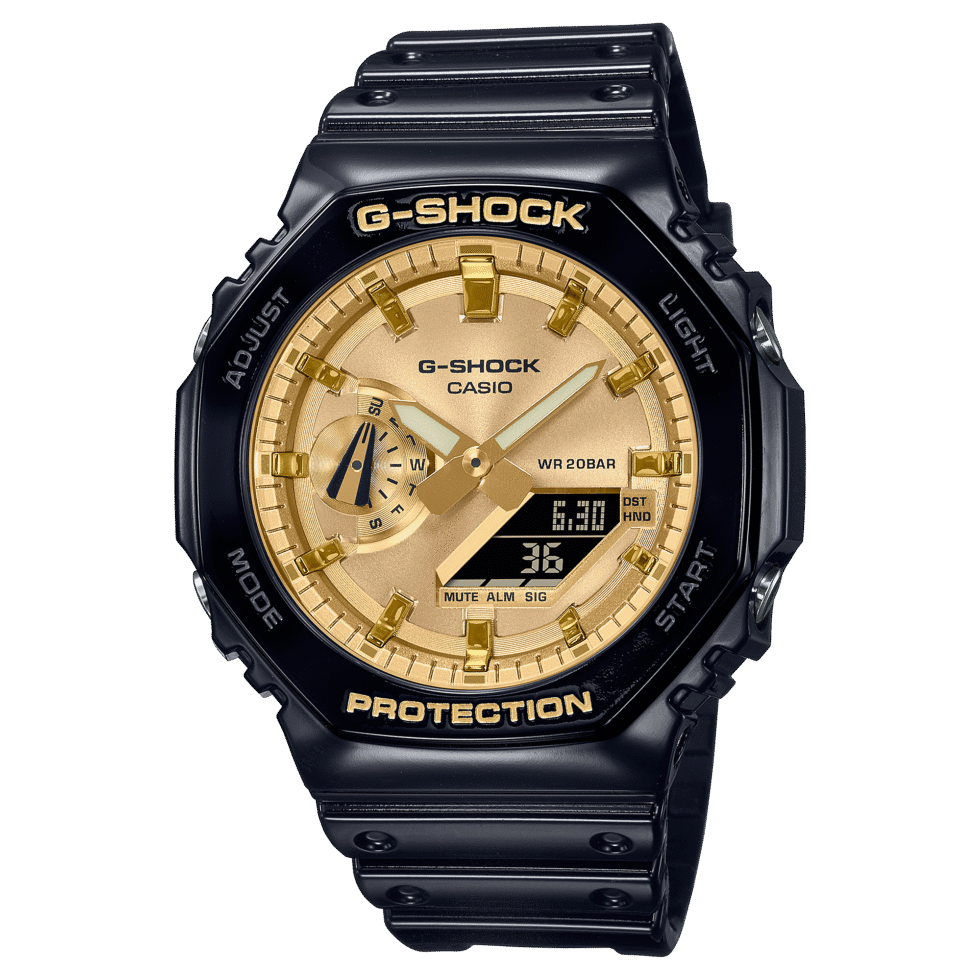 The polished gleam of metallic color and the iconic octagonal form of the DW-5000C, the original G-SHOCK, come together in a rugged digital analog combination timepiece measuring just 11.8mm from bezel to case back. A slim design with the same tough G-SHOCK construction.