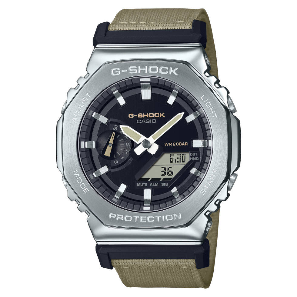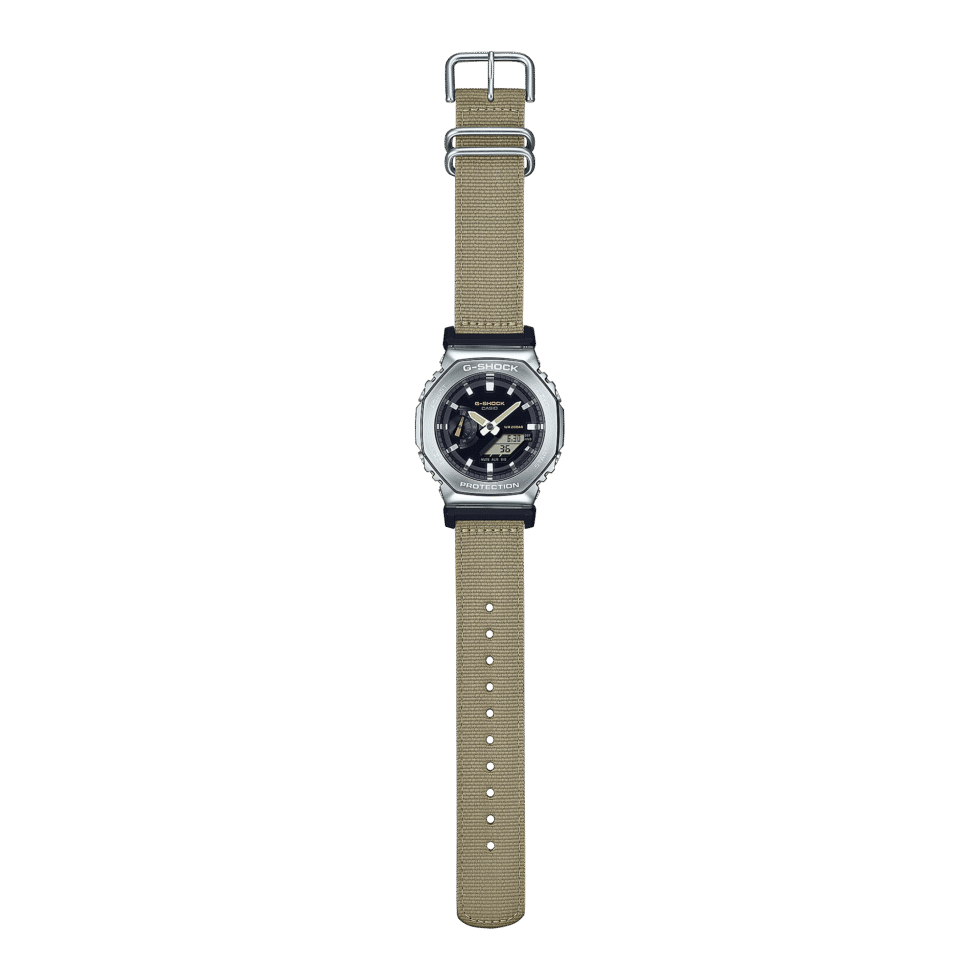 These innovative watches take the iconic octagonal form and metal-clad design of the GM-2100 line and pair it with a rugged fabric band in an utilitarian color that goes with any outfit.
