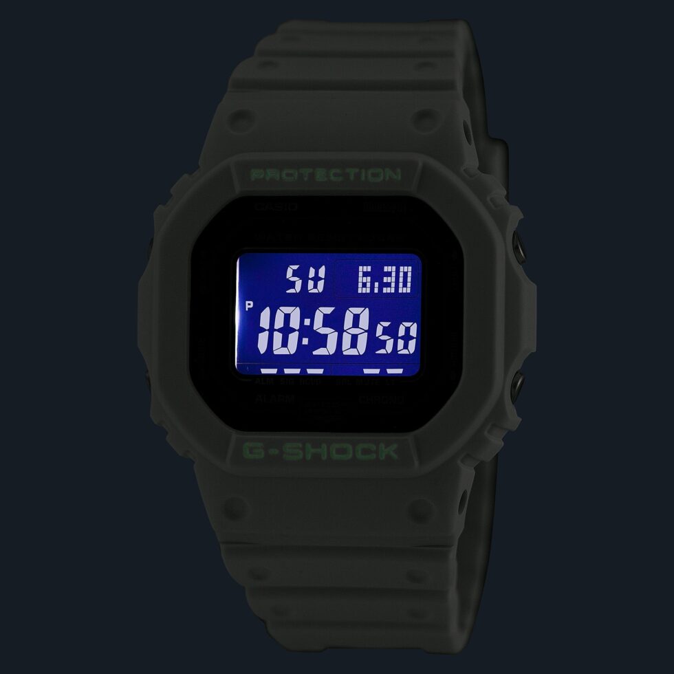 Inspired by the pages of science fiction, the crisp and clean white design is accented with touches of blue and purple. The bezel is printed with glow-in-the-dark paint that makes the G-SHOCK logo appear in the dark.