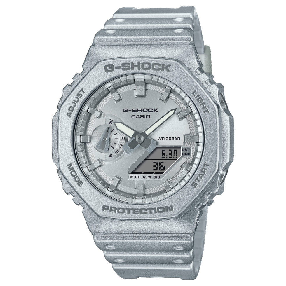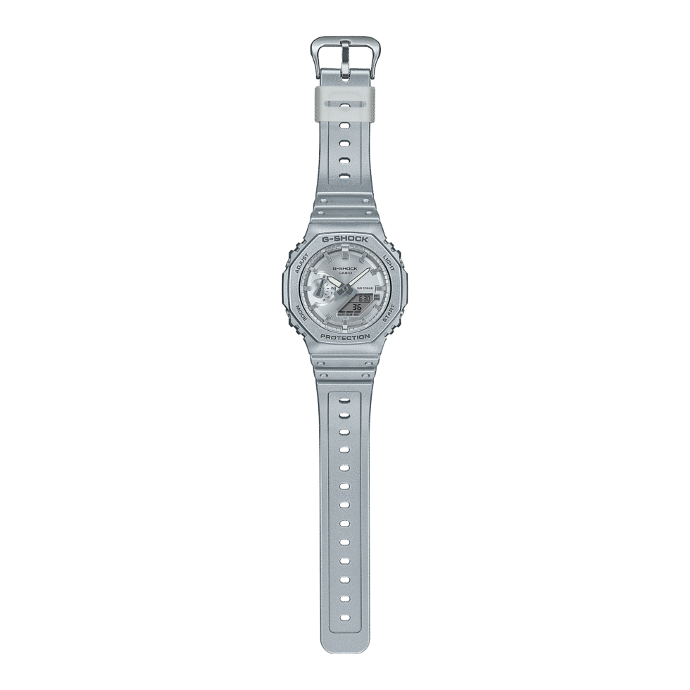 Garbed in a full-body metallic silver paint, the GA-2100FF-8A exemplifies G-SHOCK’s commitment to innovation and design. A circular hairline finish on the dial contrasts beautifully with the shimmering case and bezel, giving the watch a distinct and captivating look.