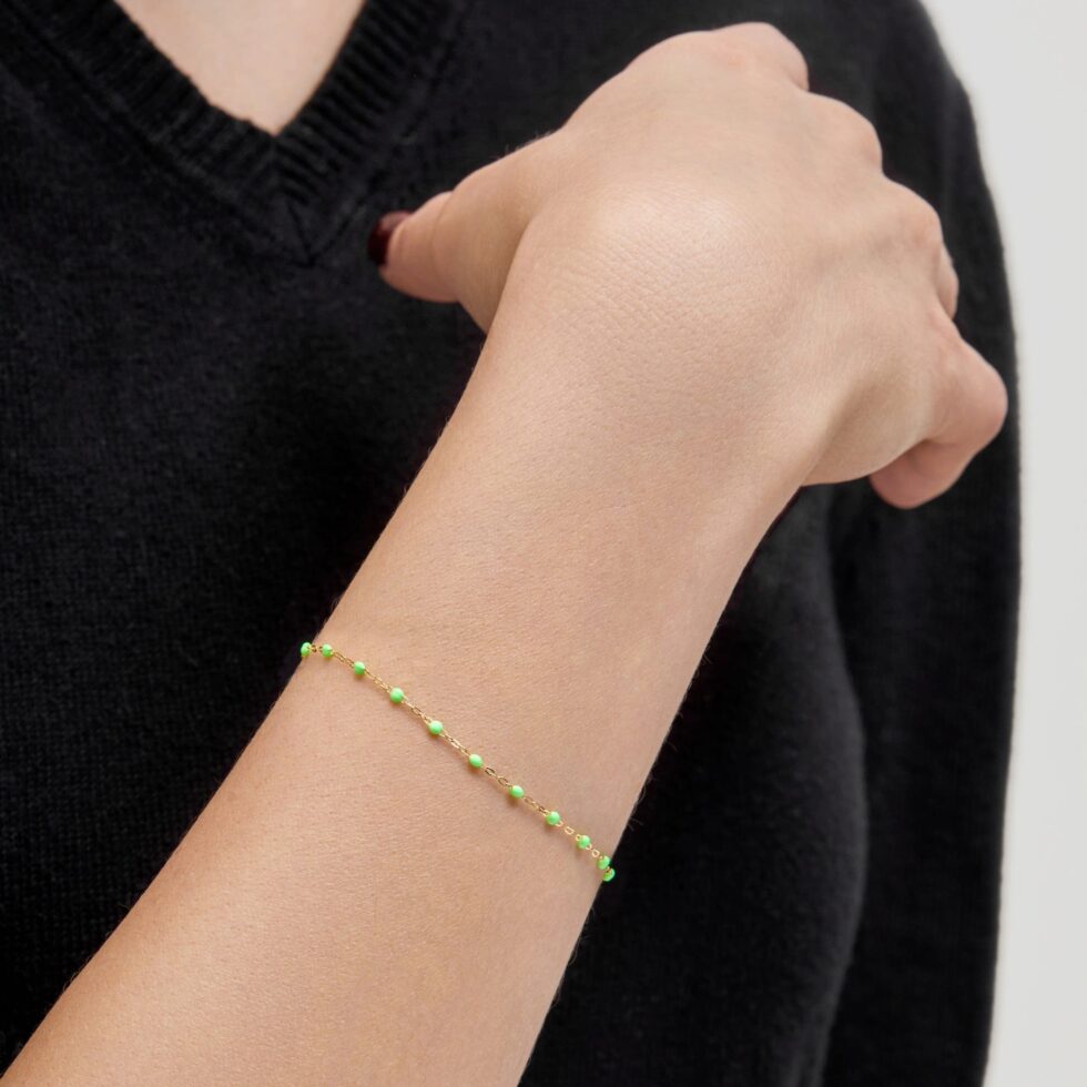 Delicate, subtle, and ready for everyday wear, the Classic Gigi Bracelet by French brand Gigi Clozeau is designed in 18-karat yellow gold and adorned with resin beads in the shade Anis. Crafted by hand at the designer’s family-owned factory in the South of France, this cult-favorite accessory is a nod to classic rosary beads. Stack several for a chic, layered look.