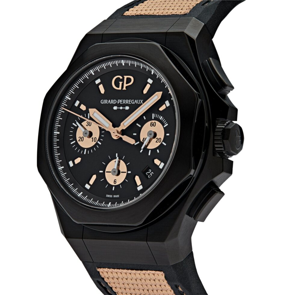 In 1975, the Girard-Perregaux Laureato was released for the first time. It adopted a new, very innovative design language from the start. Indeed, the model’s skillful use of shapes, such as juxtaposing the octagonal bezel with circular forms and straight lines, gave it a decidedly sporty vibe, albeit one with a healthy dose of elegance. A legend was born with the introduction of the Laureato. The Laureato Absolute Gold Fever is a limited edition of 188 pieces. The watch features a case made of titanium PVD. It measures 44mm in diameter and 14.65mm in thickness. The dial is black with gold sub-dials surrounded by gold stick hour markers. This timepiece comes on a beige and black rubber strap.Â