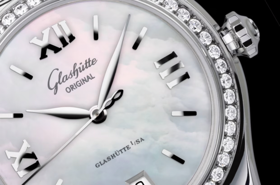 1-39-22-08-22-44 Glashutte This Watch comes with 36 mm Stainless steel case. Fixed Stainless steel bezel set with diamonds. Crown with brilliant-cut diamond (approx. 0.1 ct.). Mother-of-pearl silver dial. Silvery hour hands. Silvery Roman numerals and silvery applied hour markers. Roman numerals appear at the 3, 9 and 12 o’clock positions. Central second hand. Window for displaying the date at 6 o’clock. The watch performs following functions: hours, minutes, seconds,date. Self-winding mechanical movement is powered by a ?alibre 39-22. Power reserve approximately 40 hours. Case Thickness – 10.2 mm. Case back is transparent. Sapphire crystal protects front and back side of the watch. White/beige calfskin leather strap with tang clasp buckle. This model is water-resistant up to 50 m. Â