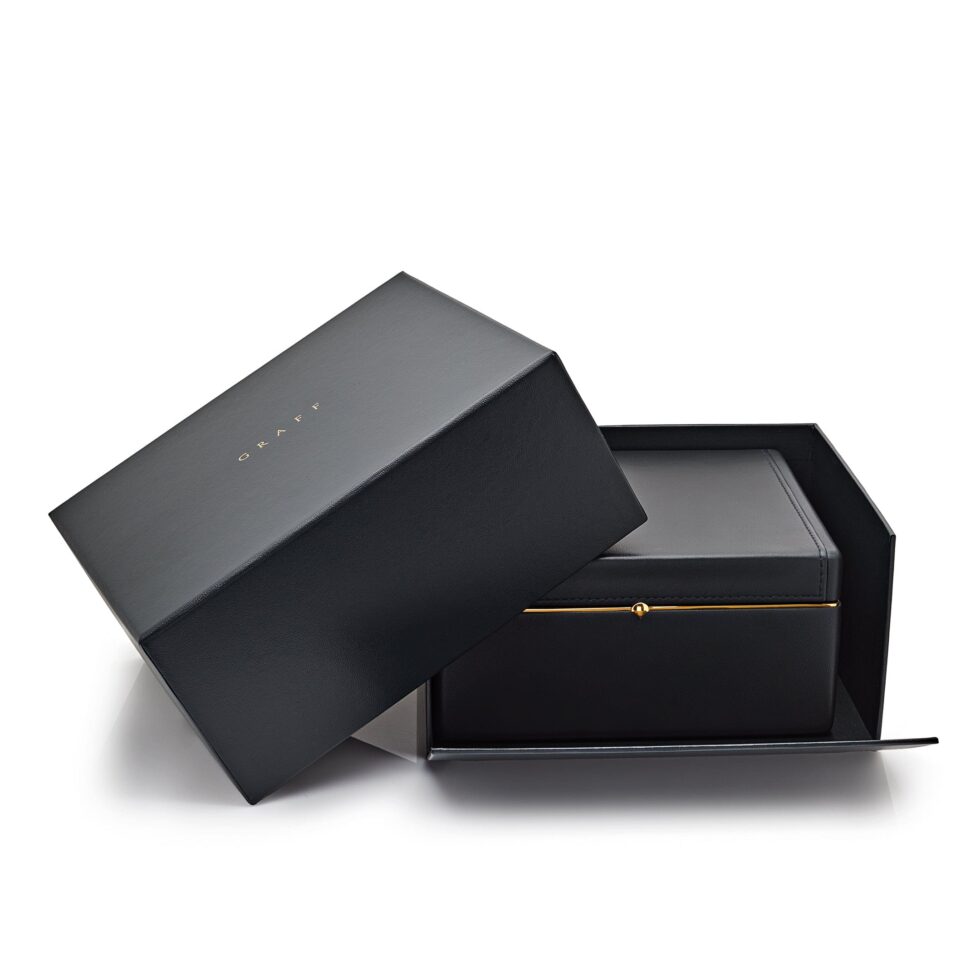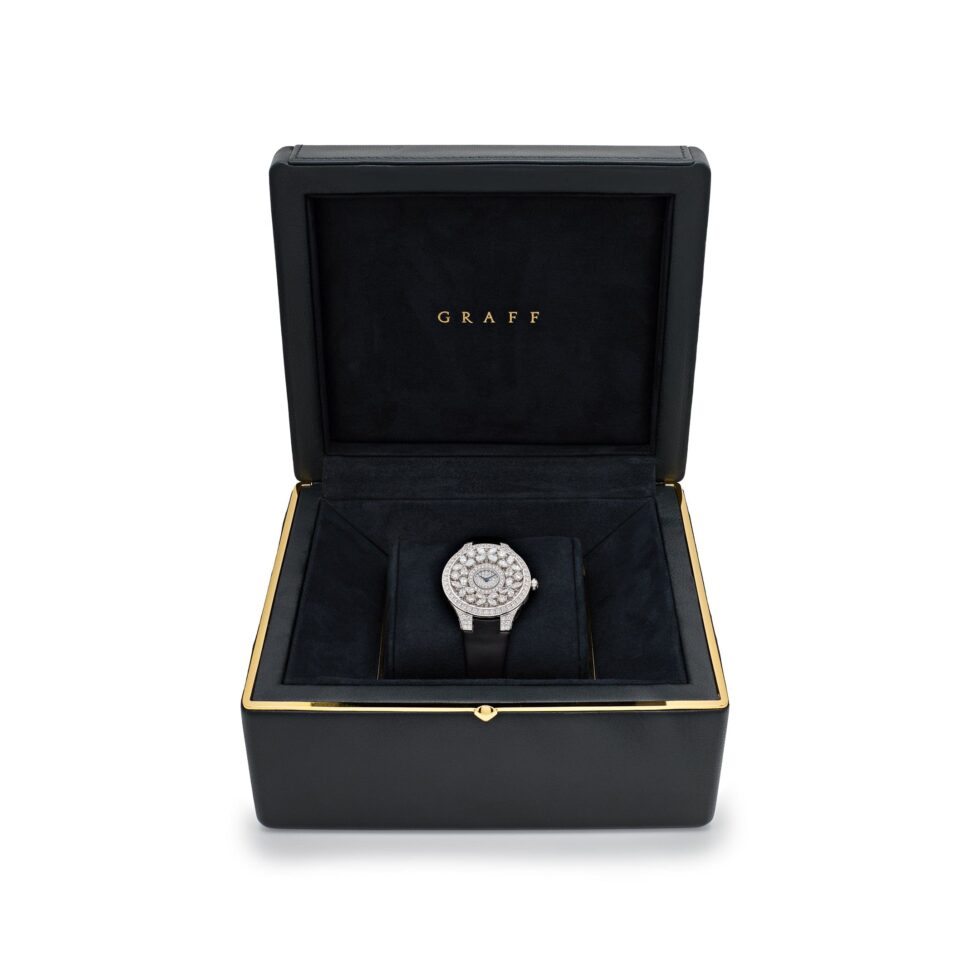 The Classic Butterfly watch by Graff, crafted in white gold and adorned with diamonds, showcases the elegance of butterflies. Set on a black satin strap, the pavé diamond dial features a kaleidoscope of butterflies with pear-shaped and marquise stones. A diamond-set clasp and crown, along with engraved butterflies on the case back, complete this exquisite timepiece.