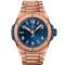 457.OX.7180.OX Hublot This watch has a 38 mm polished 18K King Gold case. Fixed polished 18K King Gold bezel is secured with 6 screws. Blue inner bezel with minute scale. Blue dial. King Gold Arabic numerals and hour markers with luminescent coating. King Gold skeleton hour hands with luminescent coating. Central second hand. The date window is located at the 3 o’clock position. The watch performs following functions: hours, minutes, seconds, date. Self-winding mechanical movement is powered by a ?alibre HUB1115. Power reserve approximately 48 hours. Case back is transparent. Sapphire crystal protects front and back side of the watch. 18K King Gold bracelet with folding clasp buckle. This model is water-resistant up to 100 m.