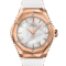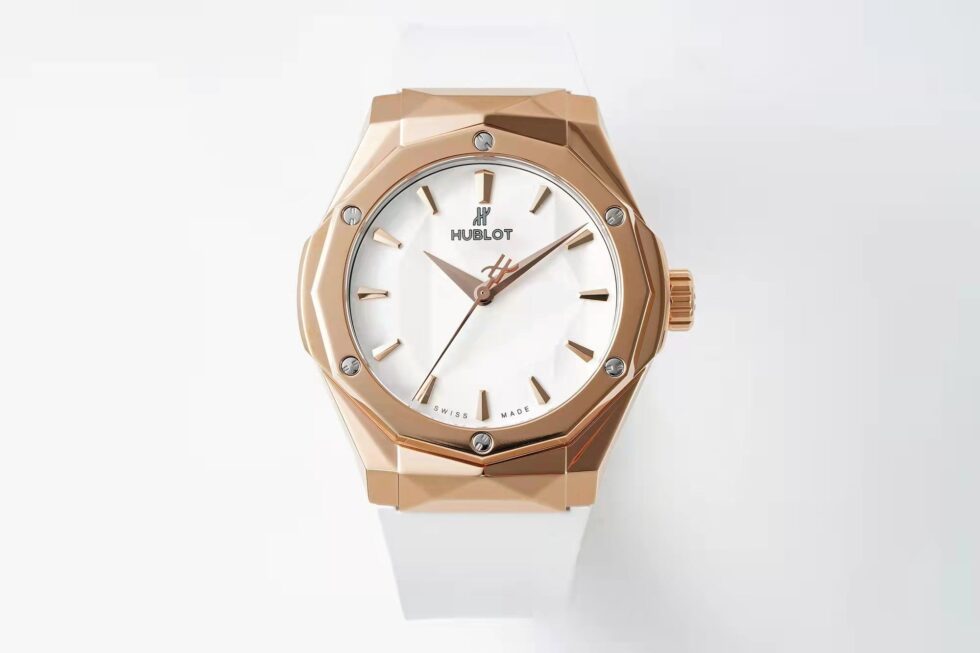 550.OS.2200.RW.ORL20 Hublot. The Hublot Classic Fusion Orlinski 550.OS.2200.RW.ORL20 is a luxury watch with a 40mm polished 18K king gold case and a polished 18K king gold fixed bezel with 6 H-shaped titanium screws. The bezel is adorned with the signature faceted design of the French sculptor Richard Orlinski. The watch has a polished faceted white dial with rose gold-tone hands and applied polished rose gold-tone hour markers. There is a central second hand and the signature of Richard Orlinski at the 12 o’clock position. The watch performs the following functions: hours, minutes, and seconds. The watch is powered by a self-winding mechanical movement, the Calibre HUB1100, which has a power reserve of approximately 42 hours. The case back is transparent, allowing the wearer to admire the movement in action. The front and back sides of the watch are protected by sapphire crystal. The watch comes with white rubber straps and an 18K 5N gold and black-plated stainless steel deployant buckle clasp. It is water-resistant up to 50 meters, making it suitable for swimming and light snorkeling, but not for diving. Overall, the Hublot Classic Fusion Orlinski 550.OS.2200.RW.ORL20 is a stunning timepiece that combines Hublot’s technical expertise with Richard Orlinski’s artistic vision, resulting in a unique and elegant watch that will appeal to collectors and enthusiasts alike.