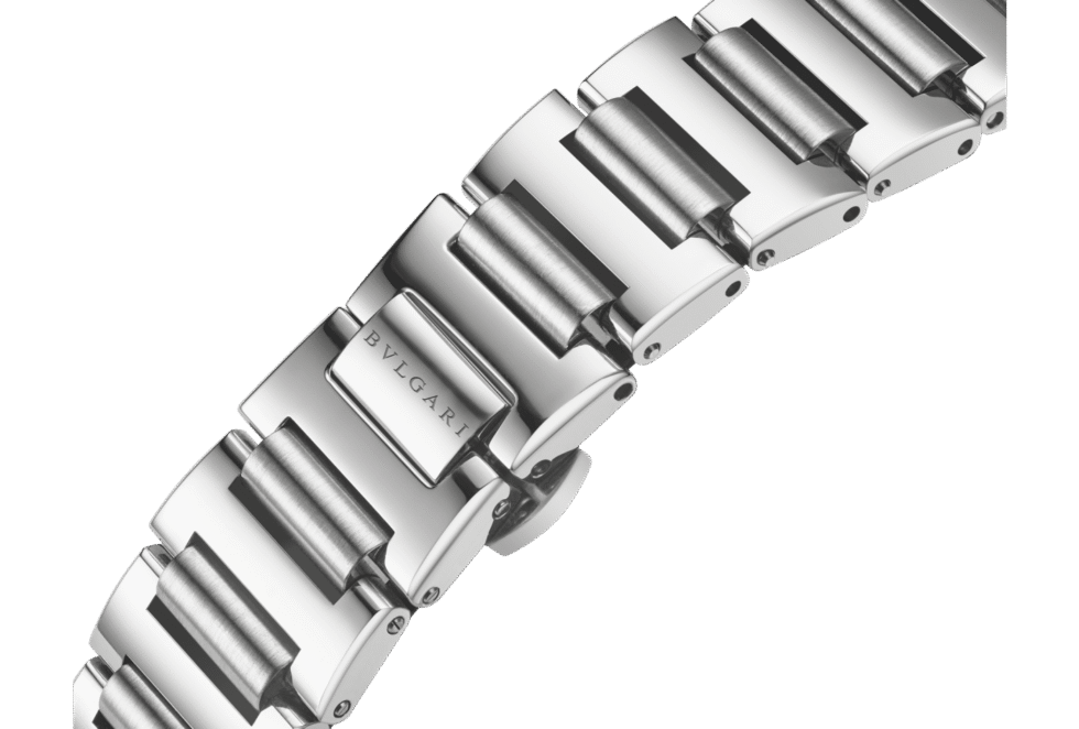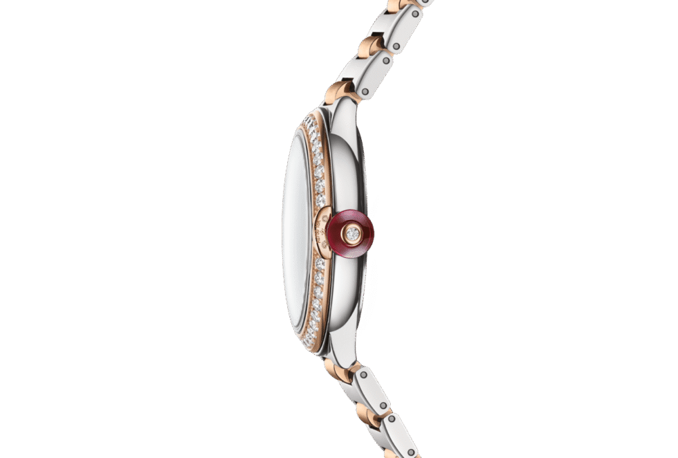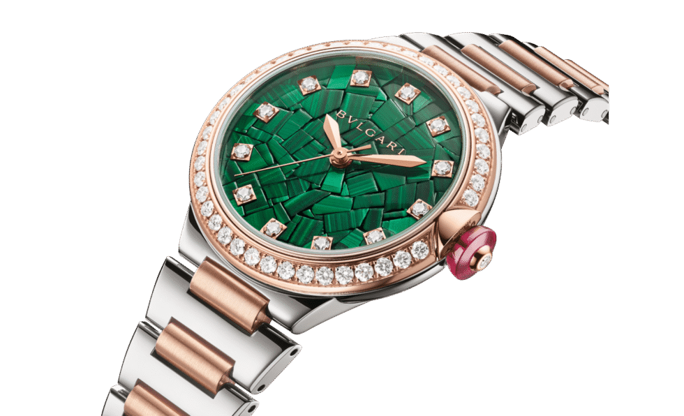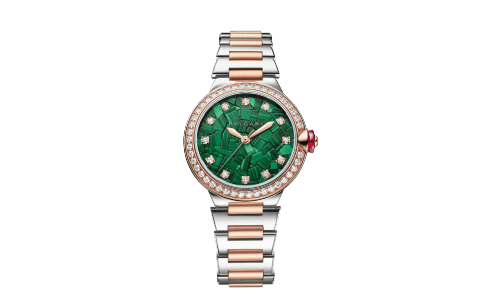 A symbol of radiant and modern femininity, the Lvcea watch brings a touch of glamour to your style and everyday life. Infused with exceptional artistry, this timepiece with polished steel case and diamond-set 18 kt rose gold bezel displays the integral bond between Bvlgari’s jewelry savoir-faire and watchmaking expertise. Its three-dimensional dial, embellished with diamond indexes, is crafted with green malachite elements, hand-assembled one by one into an exquisite gemstone marquetry. A bracelet in 18 kt rose gold and polished, satin-brushed steel completes the model.