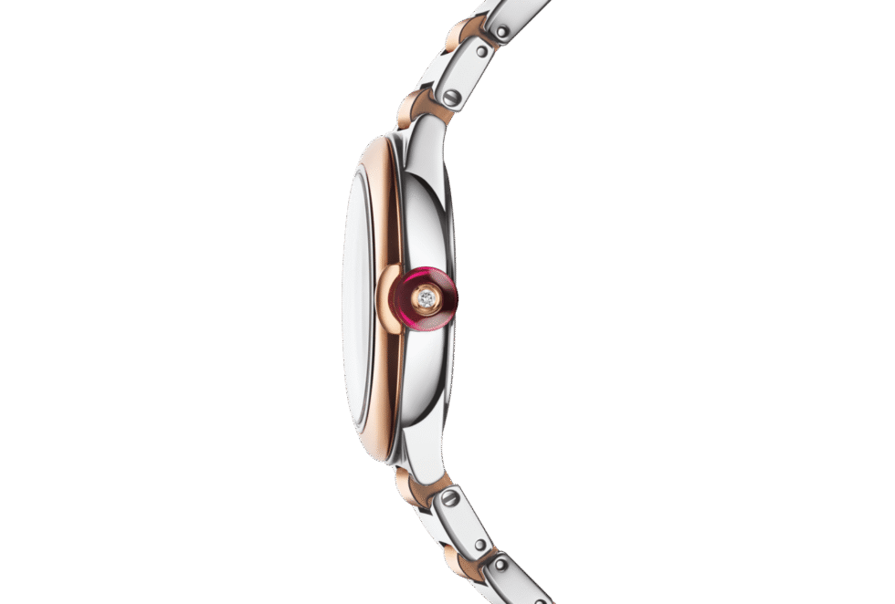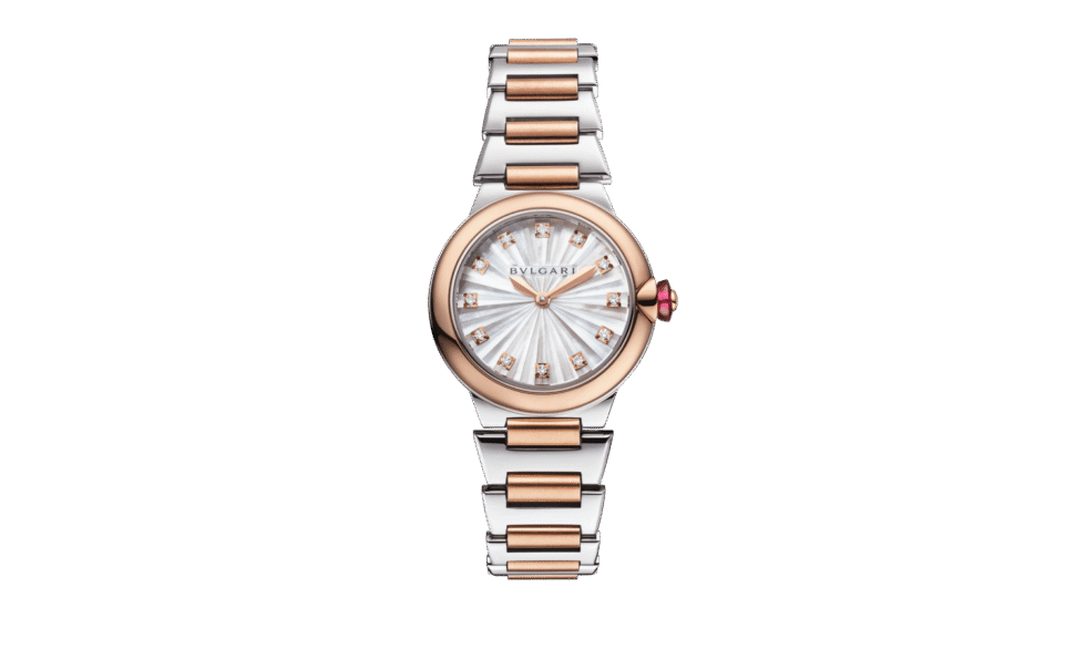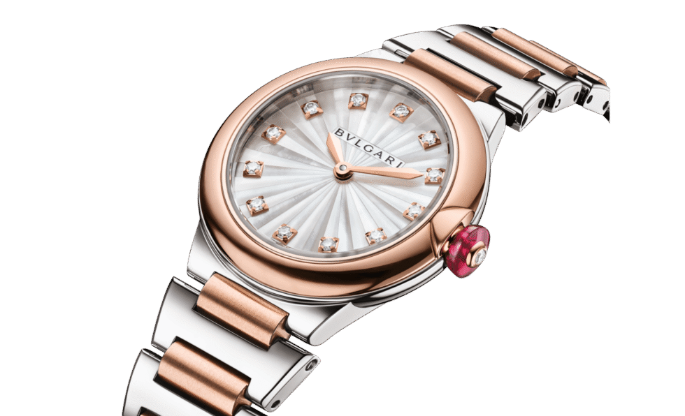 A symbol of radiant and modern femininity, the Lvcea watch brings a touch of glamour to your style and everyday life. Infused with exceptional artistry, this timepiece in 18 kt rose gold and polished, satin-brushed stainless steel displays the integral bond between Bvlgari’s jewelry savoir-faire and watchmaking expertise. Its three-dimensional dial, embellished with diamond indexes, is crafted with white mother-of-pearl elements, faceted and assembled one by one to evoke the rays of the sun, using a classic métiers d’art technique inspired by “intarsia”.