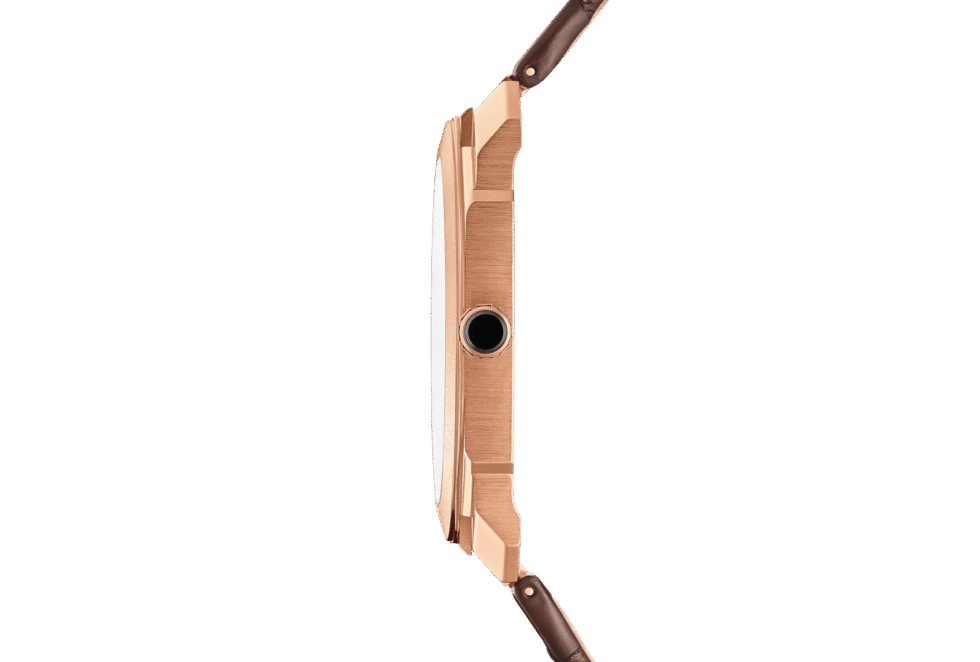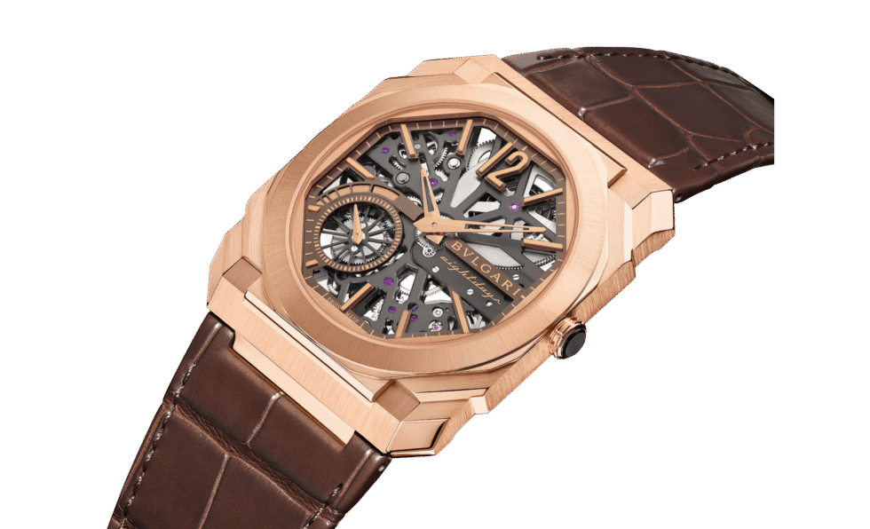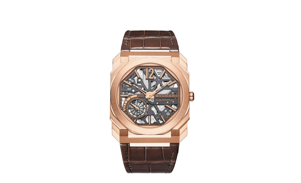Playing on the contrasts between an 18 kt rose gold case and the transparency of its iconic case for perfect legibility, the Octo Finissimo Skeleton 8 Days watch offers horlogerie connoisseurs an insight into the inner workings of its spectacular hand-wound and ultra-thin manufacture movement. A perfect fusion of Italian design and Swiss watchmaking expertise, the timepiece is endowed with an impressive 8-day power reserve and it comes with an elegant dark brown alligator bracelet.
