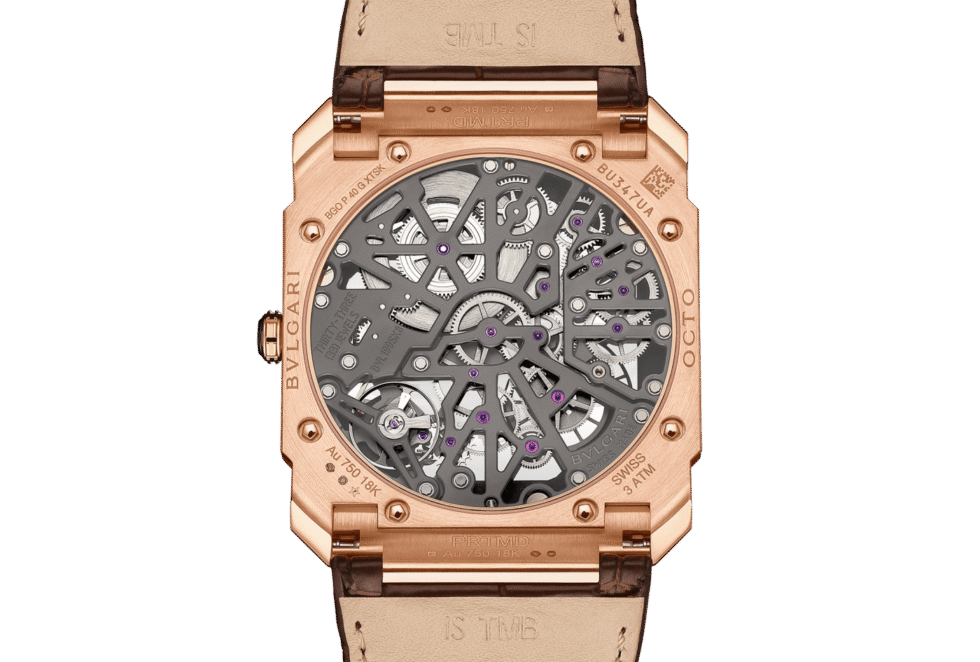 Octo Finissimo Skeleton 8 Days watch with mechanical manufacture ultra-thin movement with manual winding, BVL 199 SK caliber (2.50 mm thick), anthracite PVD Skeleton bridges, small seconds, 8 days (192-hour) power reserve and 21’600 VpH (3Hz) frequency. 40 mm 18 kt rose gold case (5.95 mm thick), open 18 kt rose gold crown set with a black ceramic insert, openwork dial with power reserve indicator and small second counter, Bvlgari eight days, logo, golden hands, transparent caseback, dark brown alligator bracelet with pin buckle. Water-resistant up to 30 meters.