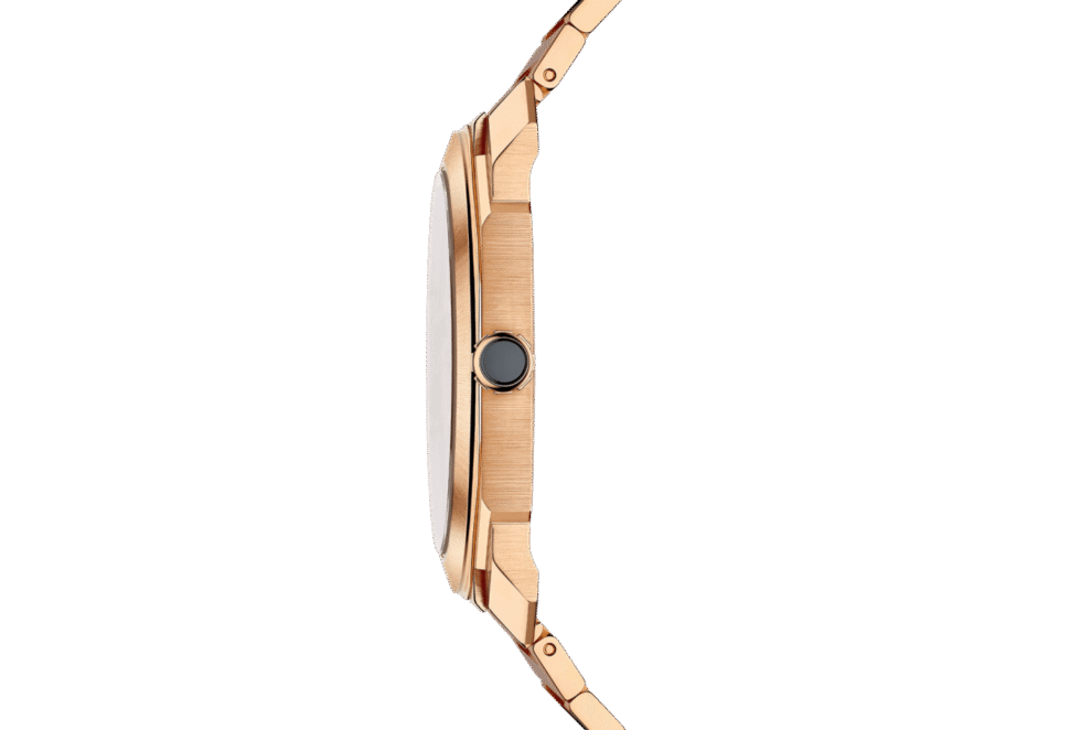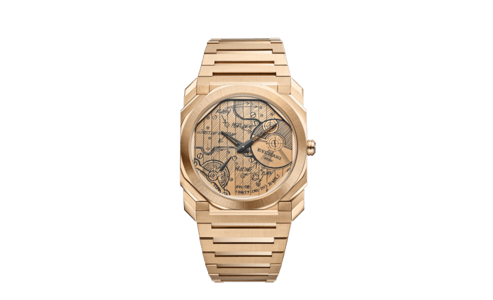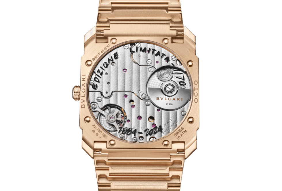 Octo Finissimo Automatic watch with mechanical manufacture ultra-thin movement (2.23 mm thick), automatic winding, platinum microrotor, hours, minutes and small seconds functions, BVL138 caliber, frequency 21’600 Vph (3 Hz), 36 Jewels, 60 hour power reserve. 40 mm satin-polished 18 kt rose gold case (6.40 mm thick), polished 18 kt rose gold screw-down crown with ceramic insert, satin-vertical 18 kt rose gold dial with sketch of the movement, black PVD hands and indexes, transparent caseback, satin-polished 18 kt rose gold bracelet and integrated folding clasp. Water-resistant up to 100 meters. Limited Edition of 70 pieces.