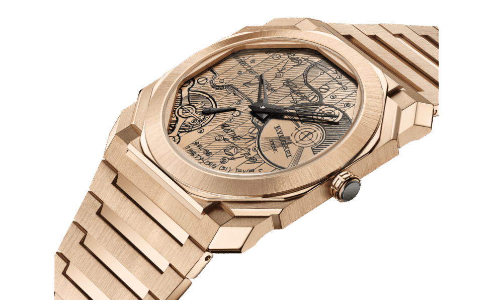 A true icon of the 21st century, the Octo Finissimo Automatic watch channels the rare fusion of edgy Italian design and Swiss engineering through its ultra-appealing look in satin-polished 18 kt rose gold and uncompromisingly forward-thinking mechanics. For this limited edition watch, the display of the satin-vertical 18 kt rose gold dial replicates the sketch of the movement that powers the watch: a tribute to the mastery of freehand drawing expressed through a sublime blend of art and technique.