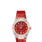 131.28.29.20.99.002 Omega The Omega Constellation Co-Axial Master Chronometer 131.28.29.20.99.002 is a luxury women’s watch that features a 29mm stainless steel case with a fixed Sedna™ Gold bezel paved with diamonds. The crown is also made of Sedna™ Gold, adding to the watch’s luxurious appearance. The watch’s red dial is decorated with diamond indexes and gold tone skeletonized hour hands, making it easy to read the time. A date window is located at the 6 o’clock position for added convenience. The watch is powered by a self-winding mechanical movement, Calibre 8700, which has a power reserve of approximately 50 hours. The case is 12.2 mm thick and has a transparent case back, allowing you to see the intricate workings of the movement. The front and back of the watch are protected by scratch-resistant sapphire crystal. The watch comes with a red alligator leather strap with a steel folding buckle, providing a comfortable fit. The watch has a water resistance of up to 50 meters, making it suitable for swimming and snorkeling but not for diving. The Omega logo in silver tone is located below the 12 o’clock position, adding to the watch’s elegant design. Overall, the Omega Constellation Co-Axial Master Chronometer 131.28.29.20.99.002 is a sophisticated timepiece that combines style, functionality, and precision.