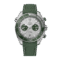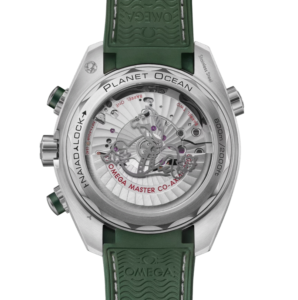 A sapphire crystal protects the front and back side of the watch. Green rubber strap with folding clasp. While the watch’s water-resistance up to 600 m ensures durability.