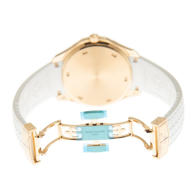 Preowned-5269/200R Patek Philippe. The Patek Philippe Aquanaut 5269/200R is a high-end luxury watch that is both stylish and functional. The watch features a 38.8 mm case made of 18K rose gold, which gives it an elegant and sophisticated appearance. The fixed bezel is also made of 18K rose gold and is set with 48 diamonds, totaling approximately 1.11 carats, adding an extra level of luxury to the watch. The watch has a matte white dial with gold-tone luminous hands and Arabic numeral hour markers. The day/night indication for home time is located at the 6 o’clock position, providing added functionality and making it easy to determine the time of day at a glance. The white rubber strap of the watch is comfortable and durable, and it features an 18K rose gold fold-over clasp that matches the case and bezel. The watch is powered by a quartz movement, the Caliber E 23-250 S FUS 24H, which provides reliable and accurate timekeeping. The watch is also water-resistant up to 60 meters or 196 feet, making it suitable for swimming and other water-related activities. This combination of style and functionality makes the Patek Philippe Aquanaut 5269/200R a popular choice for those who appreciate high-end luxury watches.