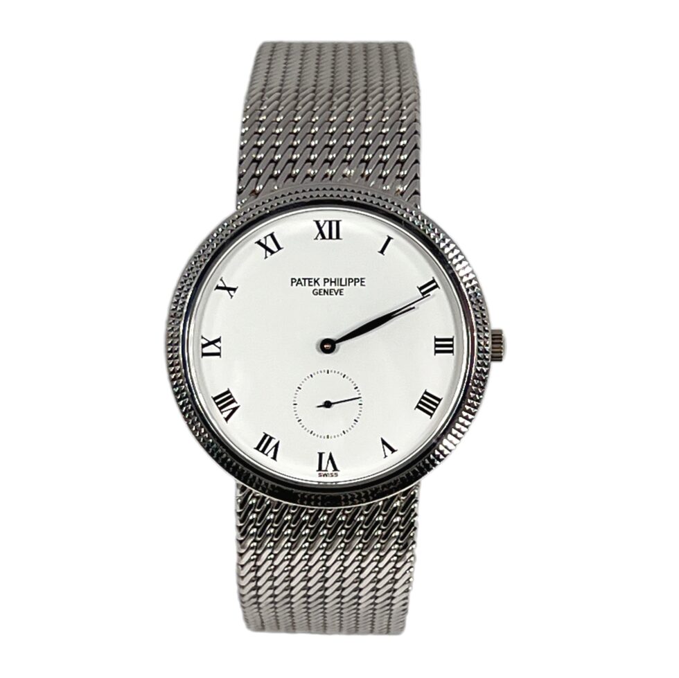 Preowned-3919G Patek Philippe This watch comes with a 33 mm 18K white gold case. Fixed 18K White Gold bezel. White dial with black Roman numerals. Leaf-shaped silver-tone hour hands. Sub-dial of small seconds is located at the 6 o’clock position. The watch performs the following functions: hours, minutes, and seconds. Manual winding movement is powered by a ?alibre 215 PS. Power reserve for approximately 44 hours. The case back is solid. Sapphire crystal protects the front side of the watch. The bracelet length is 7,5 in. This model is water-resistant up to 30 m.
