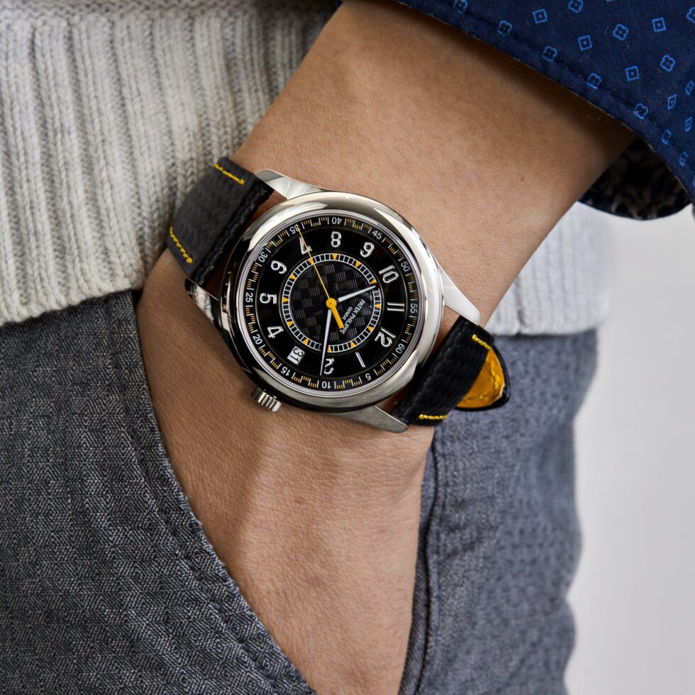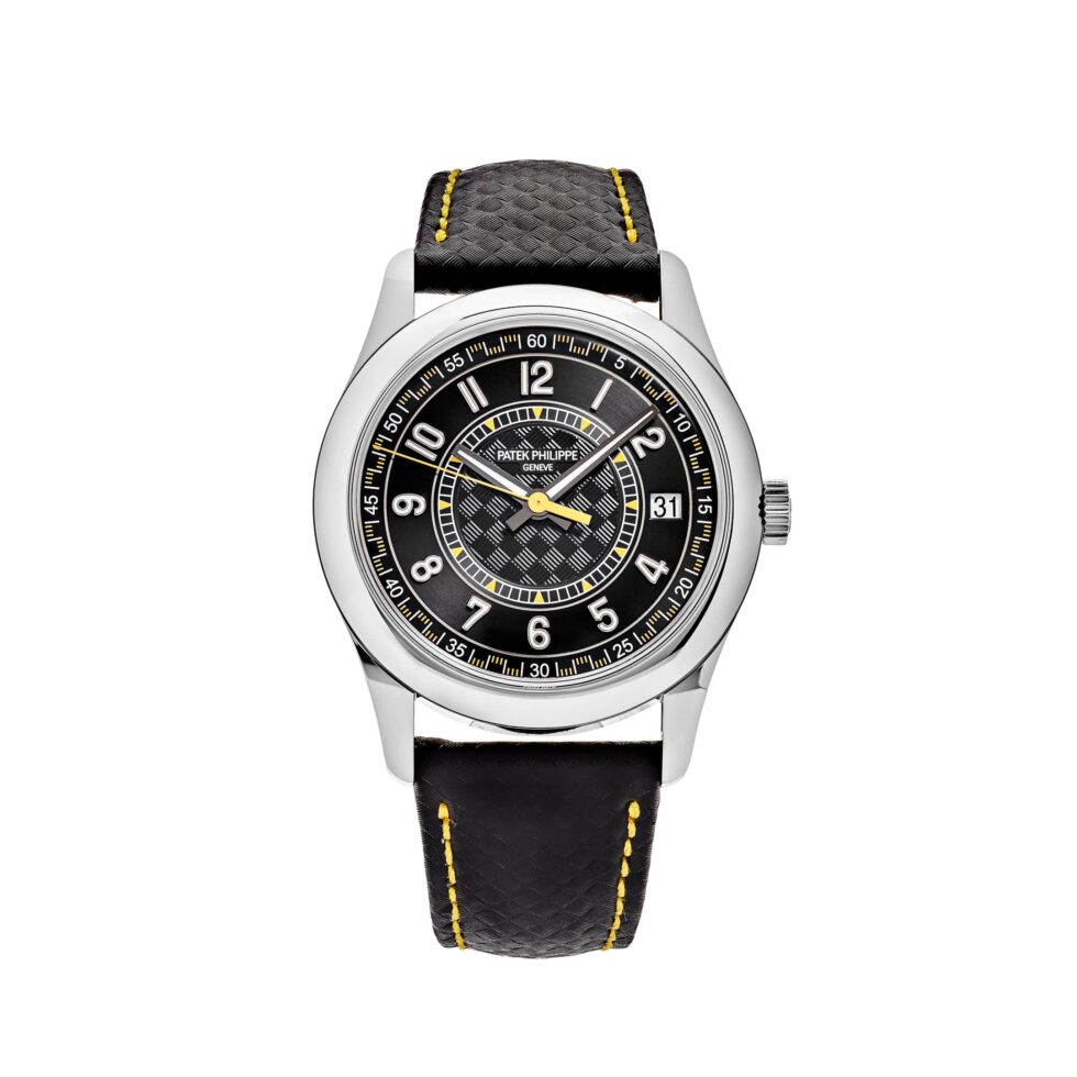 This Patek Philippe Calatrava is designed in a 40mm white gold case with a black dial and yellow accents. The center of the dial and the paired strap feature a carbon motif design, providing texture and depth throughout the timepiece. The watch is fitted on a leather strap with matching stitching that complements the yellow highlights within the dial.Â