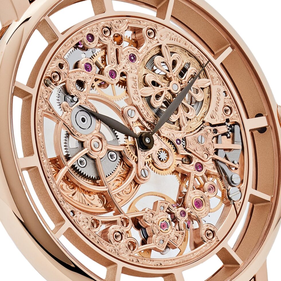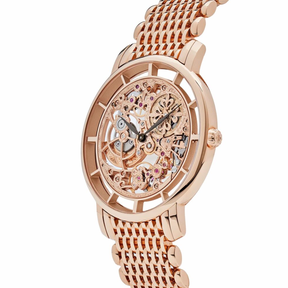 Elevate your style with the Patek Philippe Calatrava. Crafted from luxurious rose gold, the 39mm case and bracelet radiate timeless elegance. Powered by an automatic movement, this watch is not just a precise timekeeping tool – but a work of art. The skeleton dial allows you to witness the intricate complications and is engraved by hand.Â