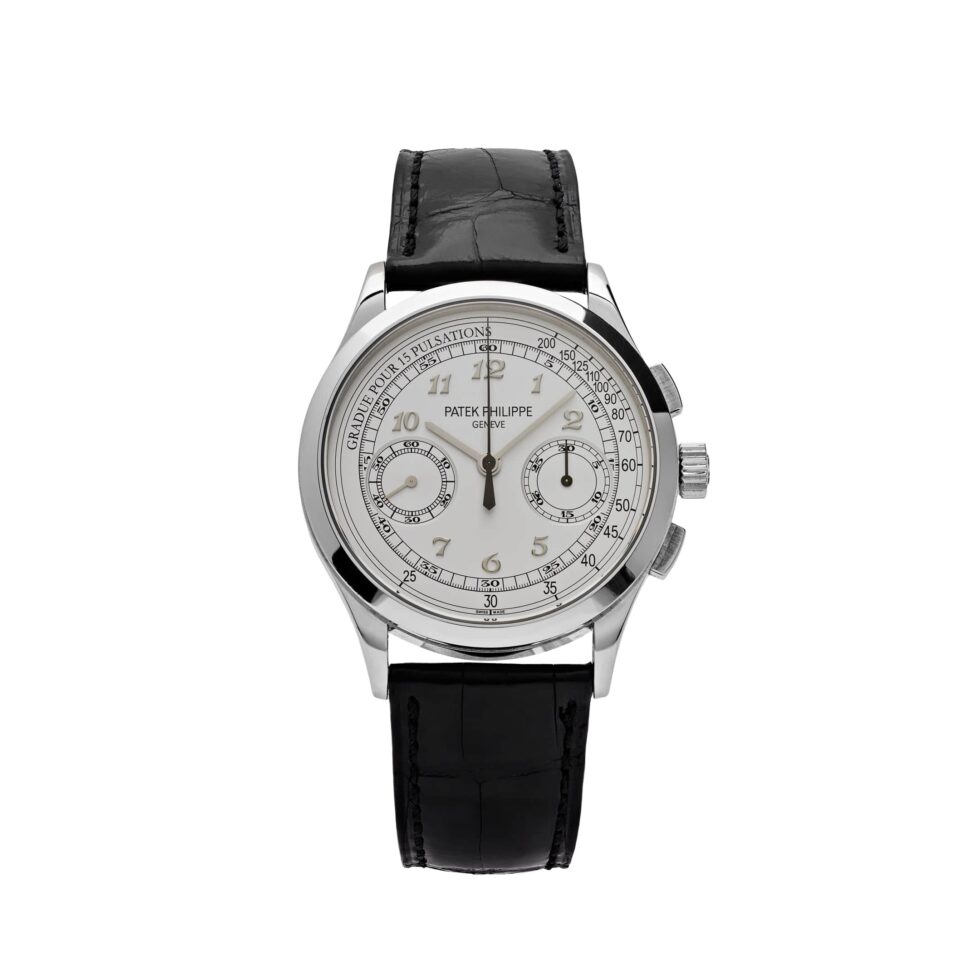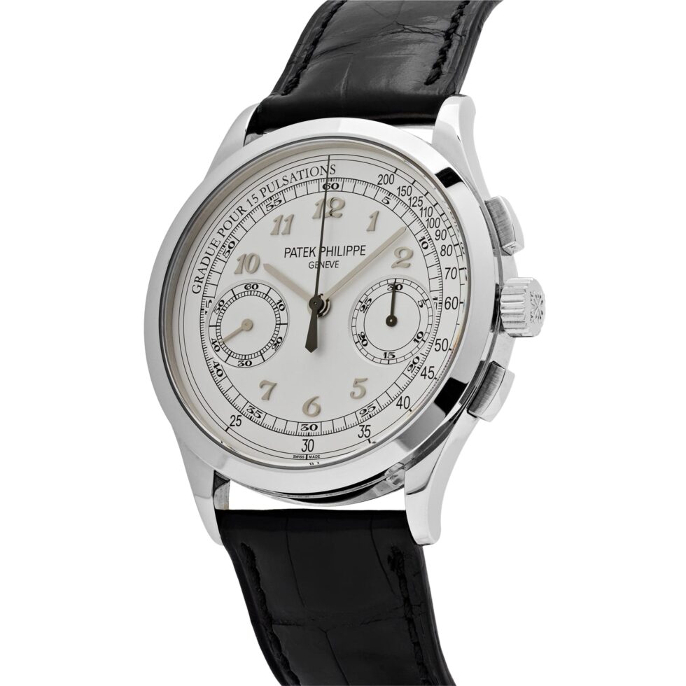 The Patek Philippe Chronograph 5170G-001 features a 39mm case crafted from 18K white gold, complemented by a smooth white gold bezel. The white dial is adorned with silver-tone hands and Arabic numeral hour markers, including a small seconds sub-dial at 9 o’clock and a 30-minute counter at 3 o’clock. The watch is paired with a black leather strap secured by an 18K white gold deployment buckle. It has a sapphire crystal and a transparent sapphire case back, showcasing its mechanical hand-wound movement.