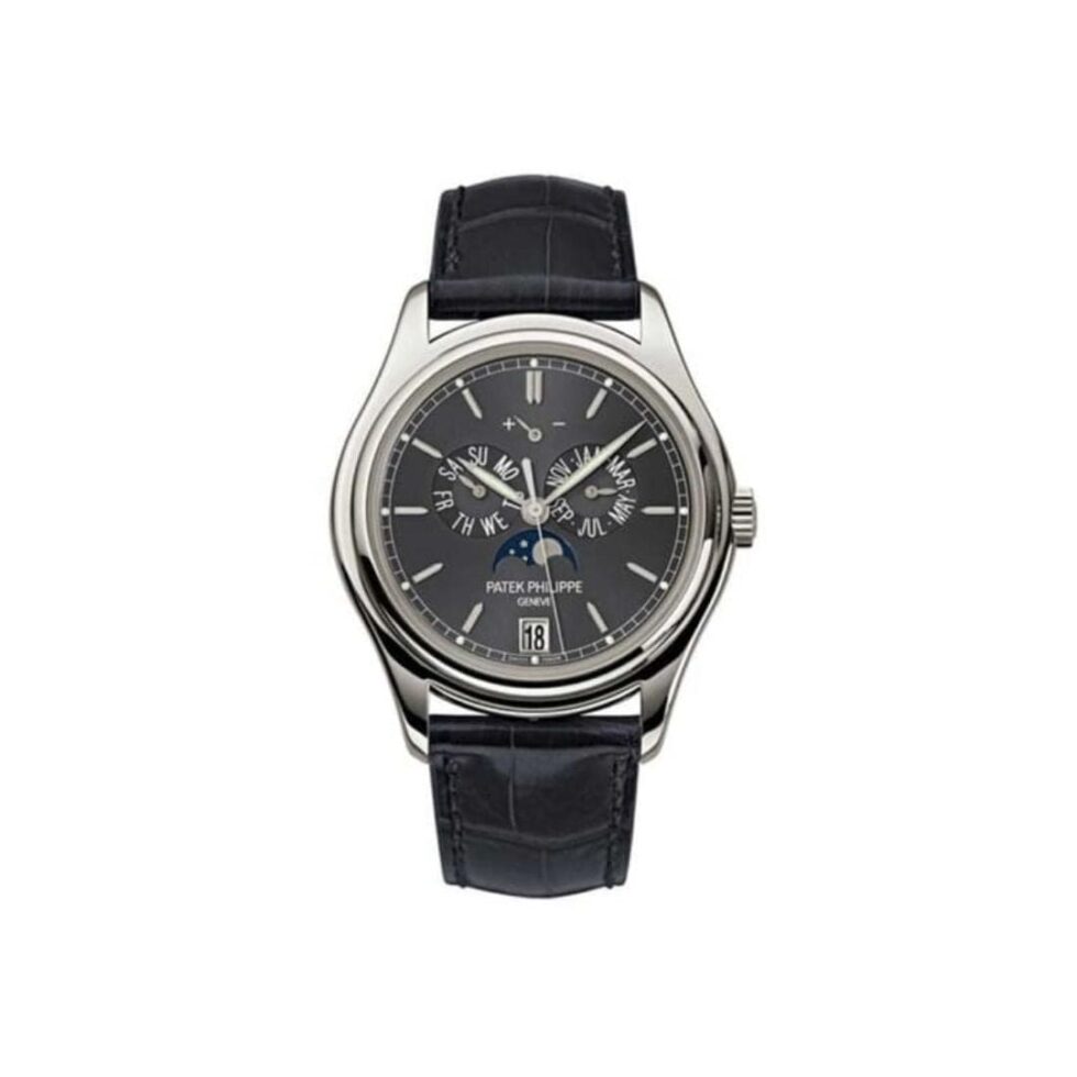 This Patek Philippe Annual Calendar Complications is crafted in a platinum case measuring 39mm in diameter. The grey dial features a moon phase, month, day and date window with luminous hands and hour markers. The watch comes on a black leather strap.