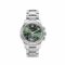 The self-winding flyback chronograph with Annual Calendar features a 39mm stainless steel case that surrounds an elegant sunburst green dial. This watch comes on a steel bracelet with a fold-over clasp.