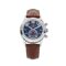 This Patek Philippe Complications Annual Calendar Flyback Chronograph is crafted in a white gold case measuring 40.5mm. The blue dial features annual calendar, chronograph, 60-minute and 12-hour mono counter, and apertures for day, date and month. The watch comes on a brown leather strap.