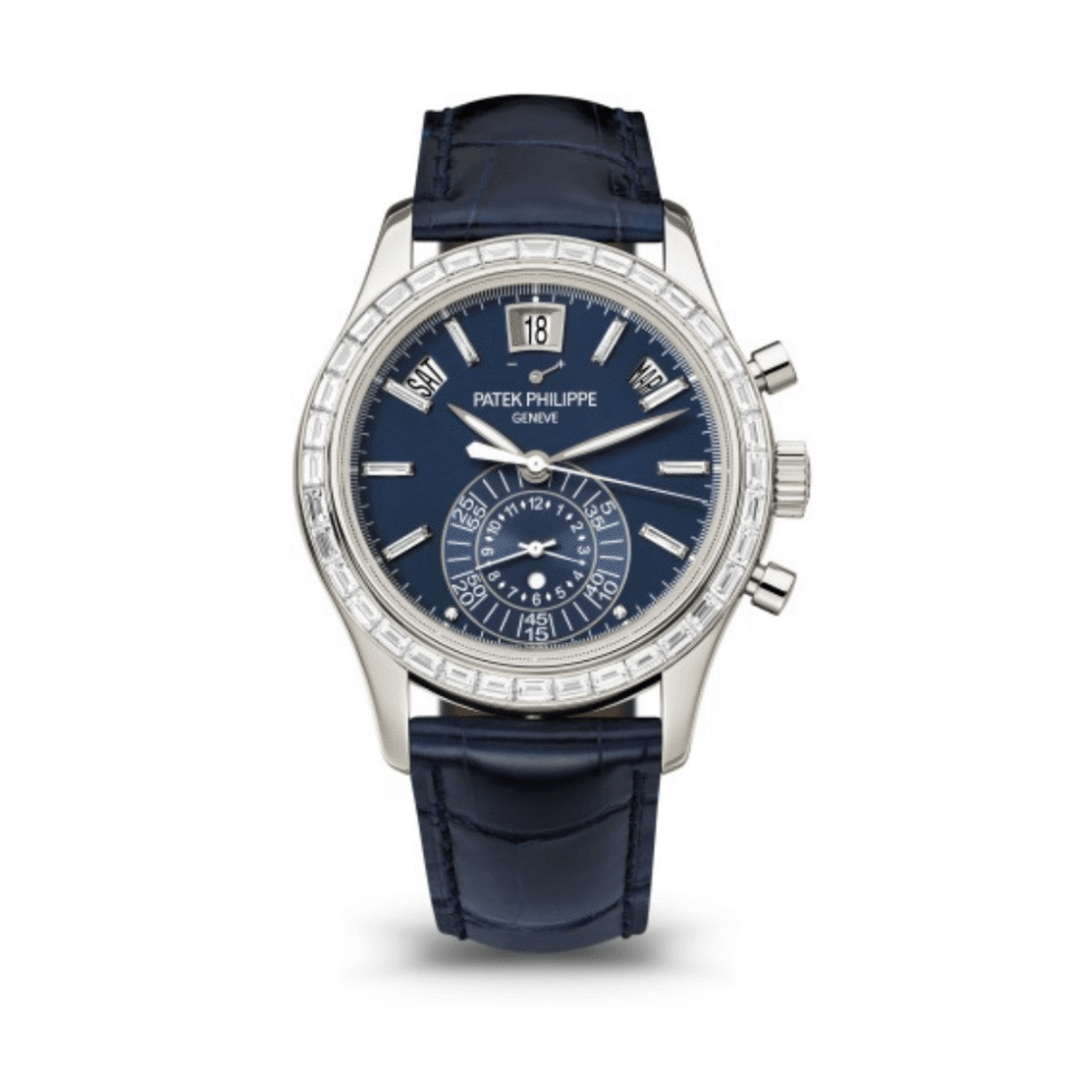 This Patek Philippe Complications 5961P-001 Annual Calendar Chronograph is crafted in a 40.5mm platinum case. Surrounded by a diamond bezel adorned with 36 Baguette-cut diamonds is a matte blue dial. Complications include annual calendar, chronograph, 60-minute timekeeping, and 12-hour mono counter timekeeping functionality; and includes apertures for day, date and month. Styled on a leather blue strap with 22 baguette diamonds set on the fold-over clasp completes the look.Â
