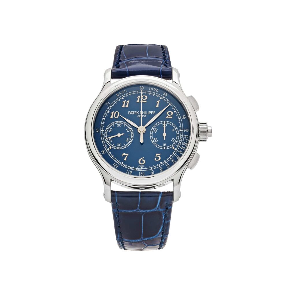 This Patek Philippe Grand Complications 5370P-001 Split-Seconds Chronograph is crafted in a 41mm platinum case and styled on a blue leather strap. The Grand Feu blue enamel dial hosts Breguet numerals and gold markers, adding a touch of contemporary style to a dial hosting various high-end complications. An exhibition case back offers a peek into the movements, or opt for the solid case back for a classic timepiece look.Â