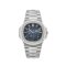 The Patek Philippe Nautilus features a round octagonal bezel and 40mm stainless steel case. In the center, lays a blue dial with moon-phase sub-dials, small seconds and a power reserve indicator. This timepiece is fitted on a stainless steel bracelet and fold-over clasp.