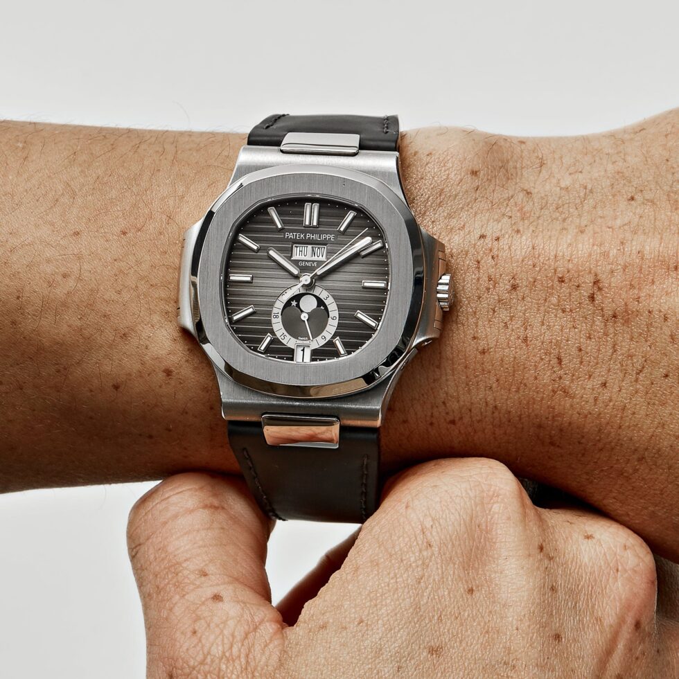 This Patek Philippe Nautilus is designed in a 40.5mm stainless steel case and styled on a leather strap. The slate dial hosts month, day, and date windows at 12 and 6 o’clock The sub-dial features 24-hour timekeeping and moon phase capabilities.