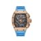 The Richard Mille RM011 Ivory and its fascinating details captures the likes of watch enthusiasts with its sleek aesthetics creating a stunning look. The 50 x 42.7mm case is created with an 18k rose gold case with Ivory colored accents on the black skeletonized dial and chronograph pushers. The blue rubber bracelet with double folding-clasp embodies the signature aesthetics of the brand making it incredibly strong, but delicate.Â