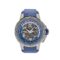 The RM 63-02 is designed with a 47mm titanium round case made up of 200 pieces. The rotating bezel includes a special wheel connected to the movement that acts directly as the hour wheel. The skeletonized gray dial features a sapphire crystal with Arabic numerals and a blue and white anodized aluminum flange around the dial to distinguish night from day. The watch is finished with a blue rubber strap.