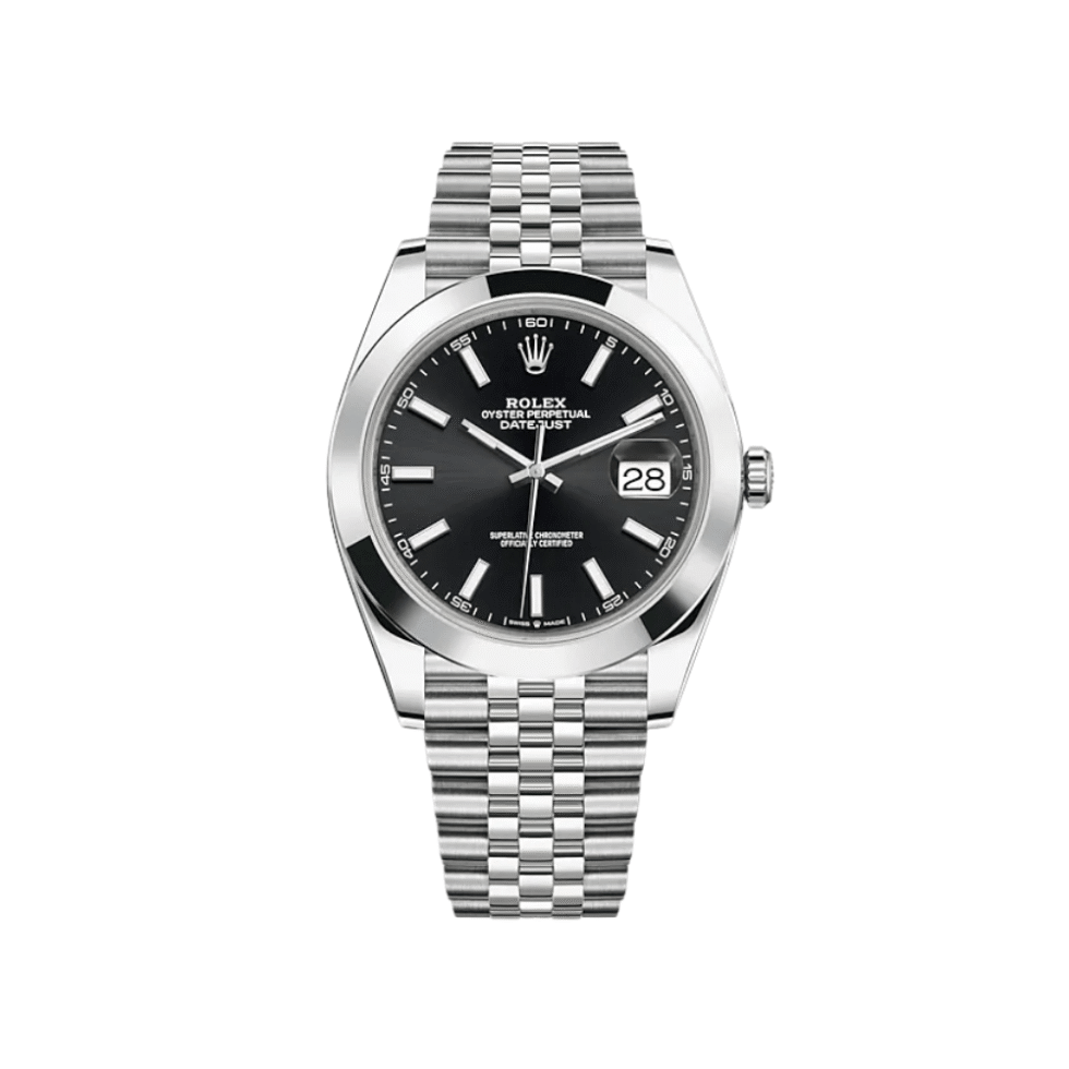 The Rolex Datejust is designed with a 41mm stainless steel case, highlighted with a classic steel smooth bezel. It features a bright black dial surrounded by luminous hands and a date display at 3 o’clock, protected by a scratch-resistant sapphire crystal. On the wrist, the stainless steel jubilee bracelet is a true beauty.