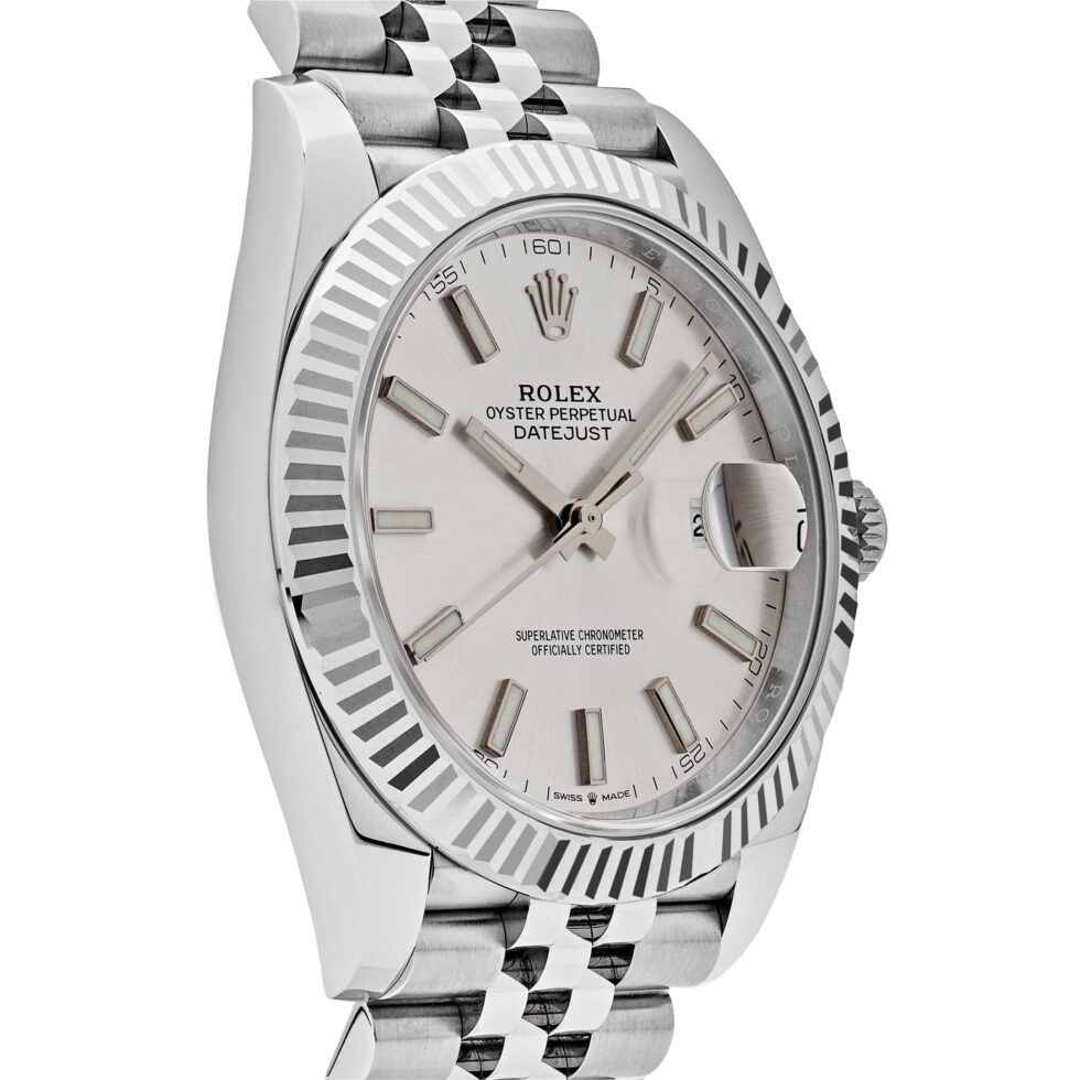 The Rolex Datejust is designed with a 41mm stainless steel case, complemented by the signature fluted bezel, and styled on a jubilee bracelet. The silver dial features stick hour markers and hands, and hosts a date feature at 3 o’clock. The Rolex Datejust is a classic model and the next addition to your collection.