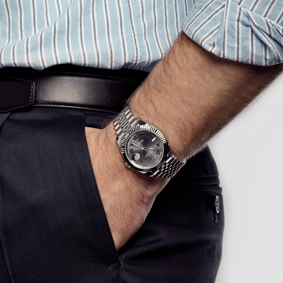 The Rolex Datejust is designed with a 41mm stainless steel case, complemented by the signature fluted bezel, and styled on a jubilee bracelet. The slate dial hosts a date feature at 3 o’clock. Roman numeral hour markers in green are representative of the famous Wimbledon court, a place where luxury and sports are perfectly paired. The Rolex Datejust 126334 is a classic model and the next addition to your collection.