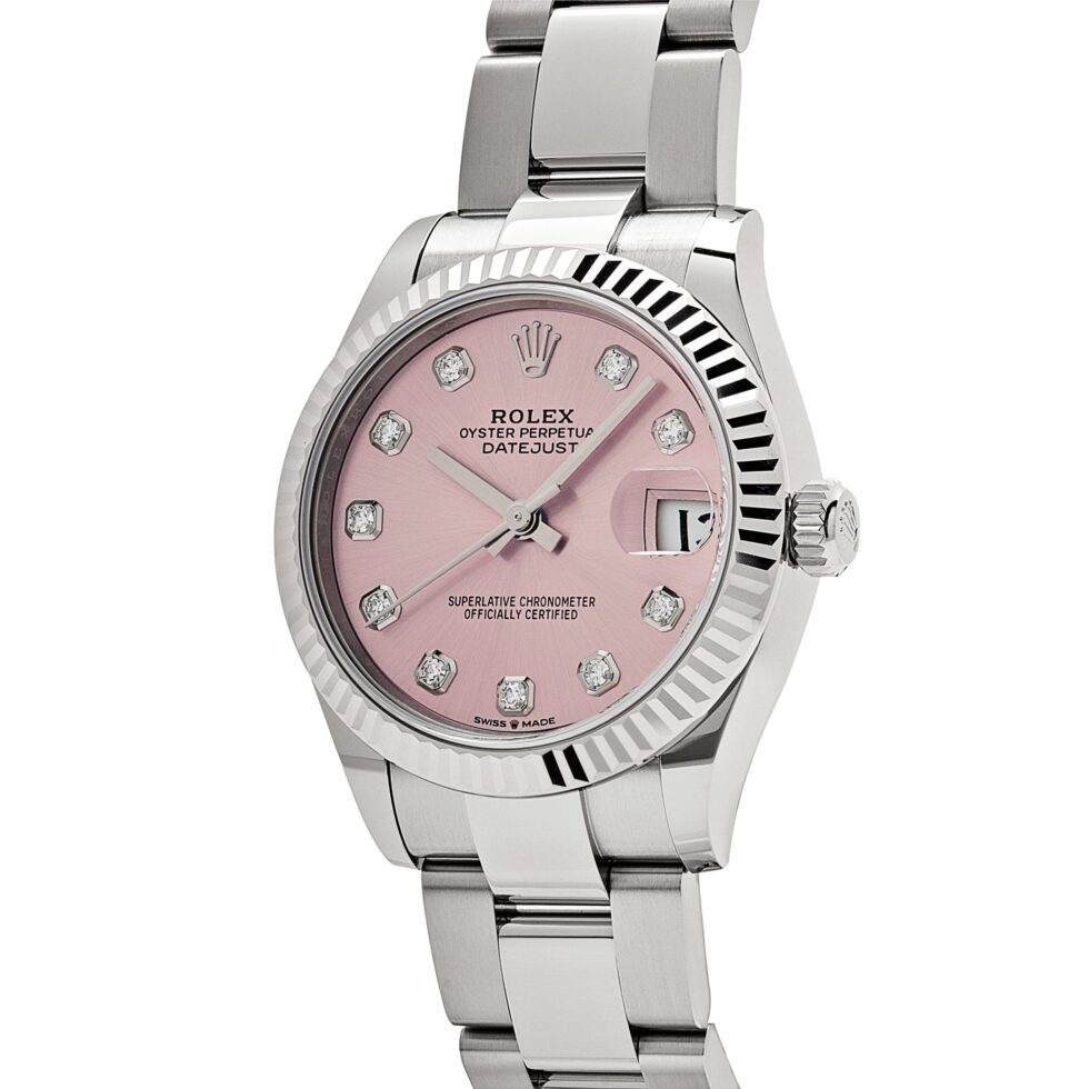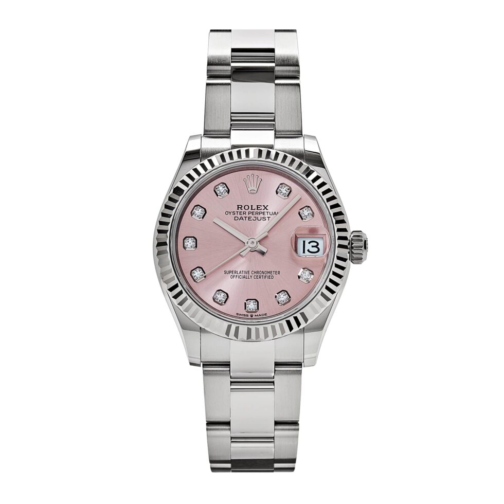 Aesthetically, the Datejust has spanned eras, while retaining the enduring codes that make it, notably in its traditional versions, one of the most recognized and recognizable of watches. This Oyster Perpetual Datejust 31 in stainless steel features a pink dial and a oyster bracelet. The light reflections on the case sides and lugs highlight the elegant profile of the 31 mm Oyster case, which is fitted with a fluted white gold bezel.Â