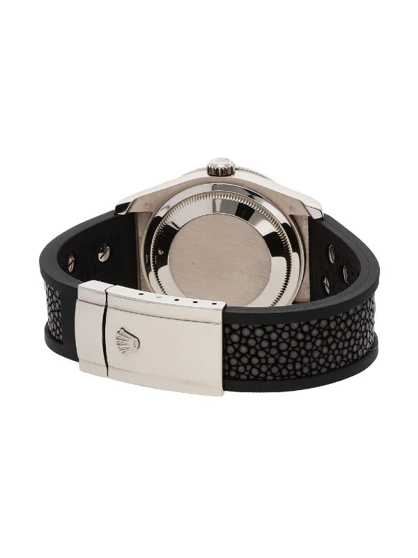 Preowned-116189BBR Rolex. The Rolex Datejust “Zebra” 116189BBR is a timepiece that epitomizes luxury, elegance, and exceptional craftsmanship. The watch boasts a 36mm 18K white gold case, radiating an air of sophistication and refinement. Its design is enhanced by an 18K white gold fixed bezel adorned with baguette diamonds, creating a stunning visual contrast. The dial of this watch is a true work of art. It’s embellished with diamonds and features a “Zebra” pattern, combining classic luxury with a contemporary twist. Silvery luminous hour hands ensure effortless readability, and the central second hand adds a touch of precision to the timekeeping. Diamond hour markers not only mark the hours but also add to the watch’s opulence. The date window is conveniently located at the 3 o’clock position, providing both form and function. This timepiece is powered by a self-winding mechanical movement, the Rolex Calibre 3135, known for its reliability and accuracy. It offers a substantial power reserve of approximately 48 hours, ensuring that you won’t need to wind it constantly. The solid case back protects the watch’s internal mechanisms, and the sapphire crystal on the front side provides scratch resistance while allowing a clear view of the exquisite dial. The strap of this watch is a blend of luxury and comfort. It combines rubber and stingray leather and is adorned with white diamonds. The folding clasp buckle ensures a secure and stylish fit on your wrist. This Rolex model doesn’t just exude luxury; it’s also a practical choice. It’s water-resistant up to 100 meters (330 feet), making it suitable for a variety of occasions, from formal events to water-based activities. The Rolex Datejust “Zebra” 116189BBR is a statement of your appreciation for the finer things in life. It’s more than a timepiece; it’s a work of art that you proudly wear on your wrist, reflecting your commitment to both timeless elegance and contemporary style.