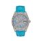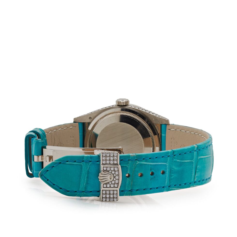 This Rolex Day-Date is designed in a 36mm white gold case set entirely with diamonds. The dial is pave diamond set with turquoise Roman numerals and hosts day-date features at 12 and 3 o’clock. This watch is styled on a turquoise leather strap.Â