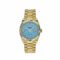 The Oyster Perpetual Day-Date is inlaid in a sophisticated 36mm 18k yellow gold case surrounding a turquiose dial with hour markers in 18 ct gold set with 32 diamonds, Roman VI and IX in 18 ct gold set with 24 diamonds. The symbolic 18k yellow gold presidential bracelet is diamond-set and includes semi-circular three-piece links and concealed Crownclasp, being the most sought-out timepiece to date.