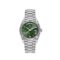 The Oyster Perpetual Day-Date is inlaid in a 40mm 18k white gold case surrounding an olive green dial with white gold Roman numerals markers and hands. The Day-Date also utilizes a process that involves screwing the case back, bezel, and Twinlock screw-down crown into the Monobloc middle case for waterproofness up to 100 meters. The 18k white gold presidential bracelet includes semi-circular three-piece links and concealed Crownclasp.