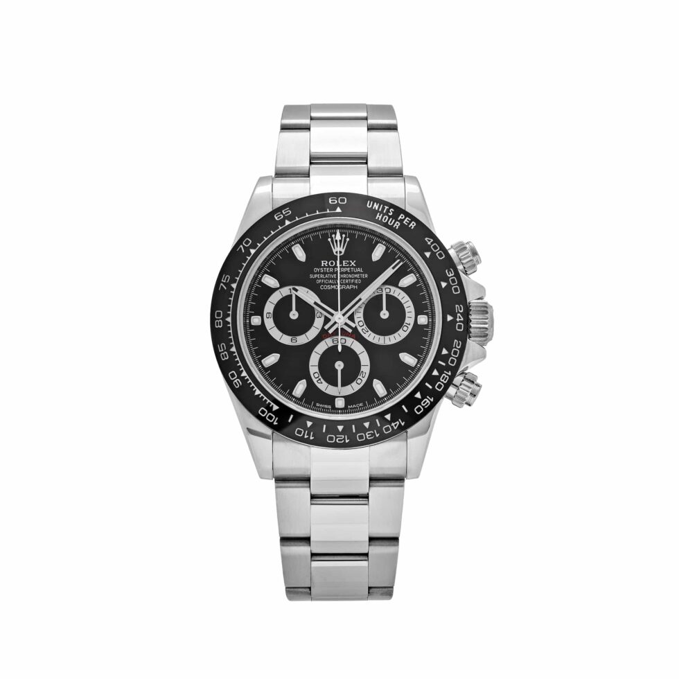 The Rolex Daytona 116500LN is designed in 40mm stainless steel with a black dial and styled on an Oyster bracelet. Luminous hour markers and hands include a Chromalight display for optimal legibility. The bezel is engraved with a tachymetric scale and hosts the high-performance Chronograph. This grail can time a speed of up to 400 kilometers per hour and remains seen as the epitome of functionality meeting fashion.