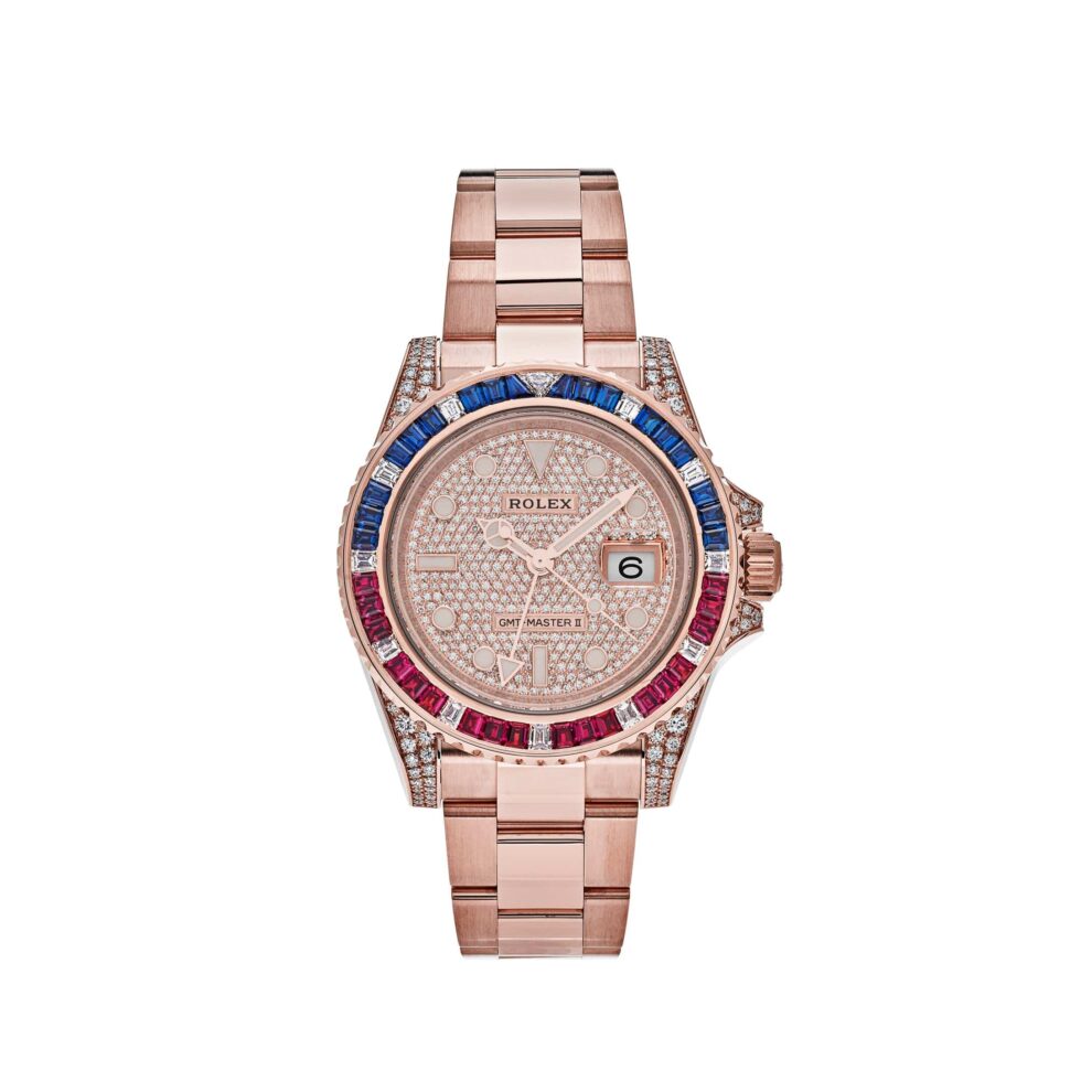 The Rolex GMT Master II is designed in a 40mm 18k rose gold case with lugs covered in 76 brilliant diamonds. The gem set bezel includes 23 diamonds, 18 rubies and 18 sapphires set in the beloved Rolex Pepsi design. Its diamond-paved dial elevates this design with luminous hour markers, a date window at 3 o clock and rose gold Mercedes hands. It is finished with a rose gold oyster bracelet and fold-over clasp.Â