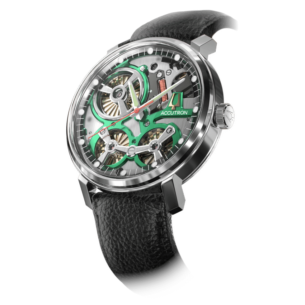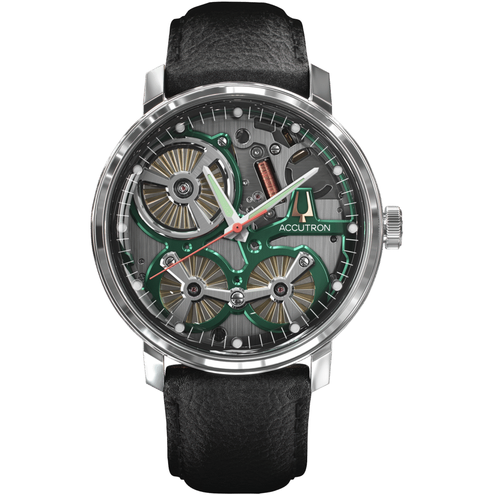 Smoke grey open-work dial with signature Accutron green accents and transparent outer ring. Light green super luminous markers, white hour and minute hands and orange second hand.
