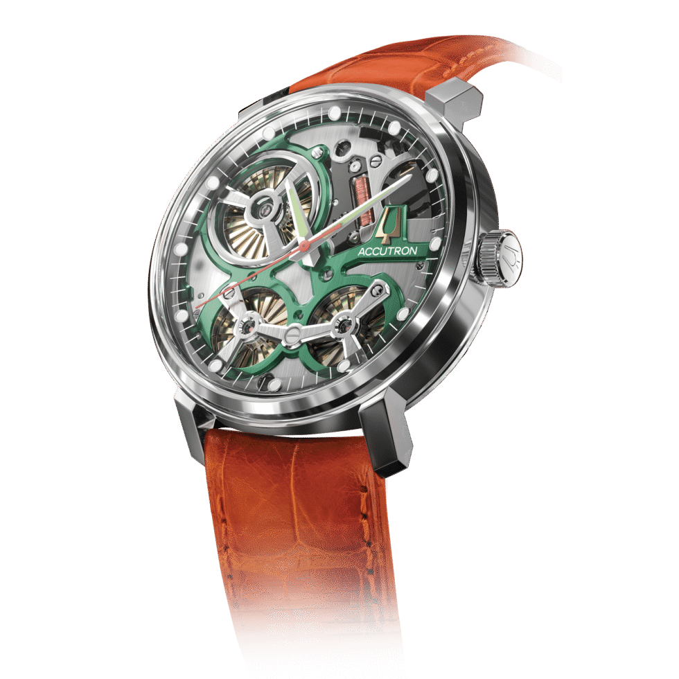 Smoke grey open-work dial with signature Accutron green accents and transparent outer ring. Light green super luminous markers, white hour and minute hands and orange second hand.