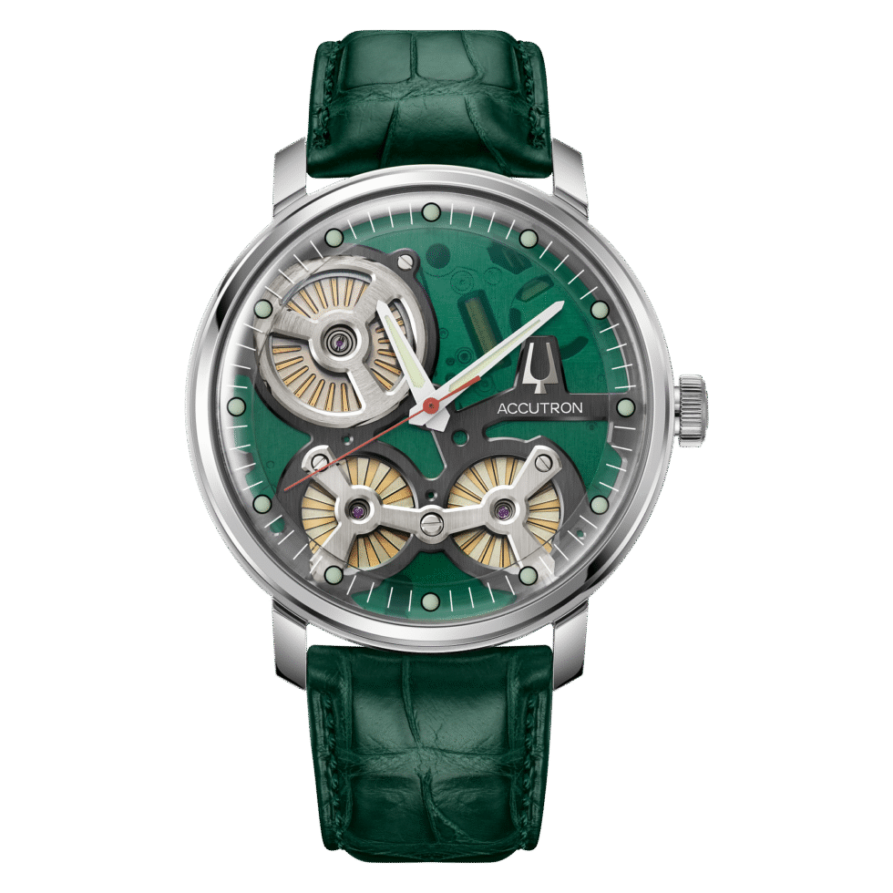 Accutron’s Proprietary Electrostatic Movement. The electrostatic energy is created by twin turbines that rotate as a result of human motion at incredible speeds between two electrodes affixed to the movement. The energy, stored in an accumulator, powers two motors; a world’s first electrostatic motor fueling the fluid second hand and a step motor powering the hour and minute hands.