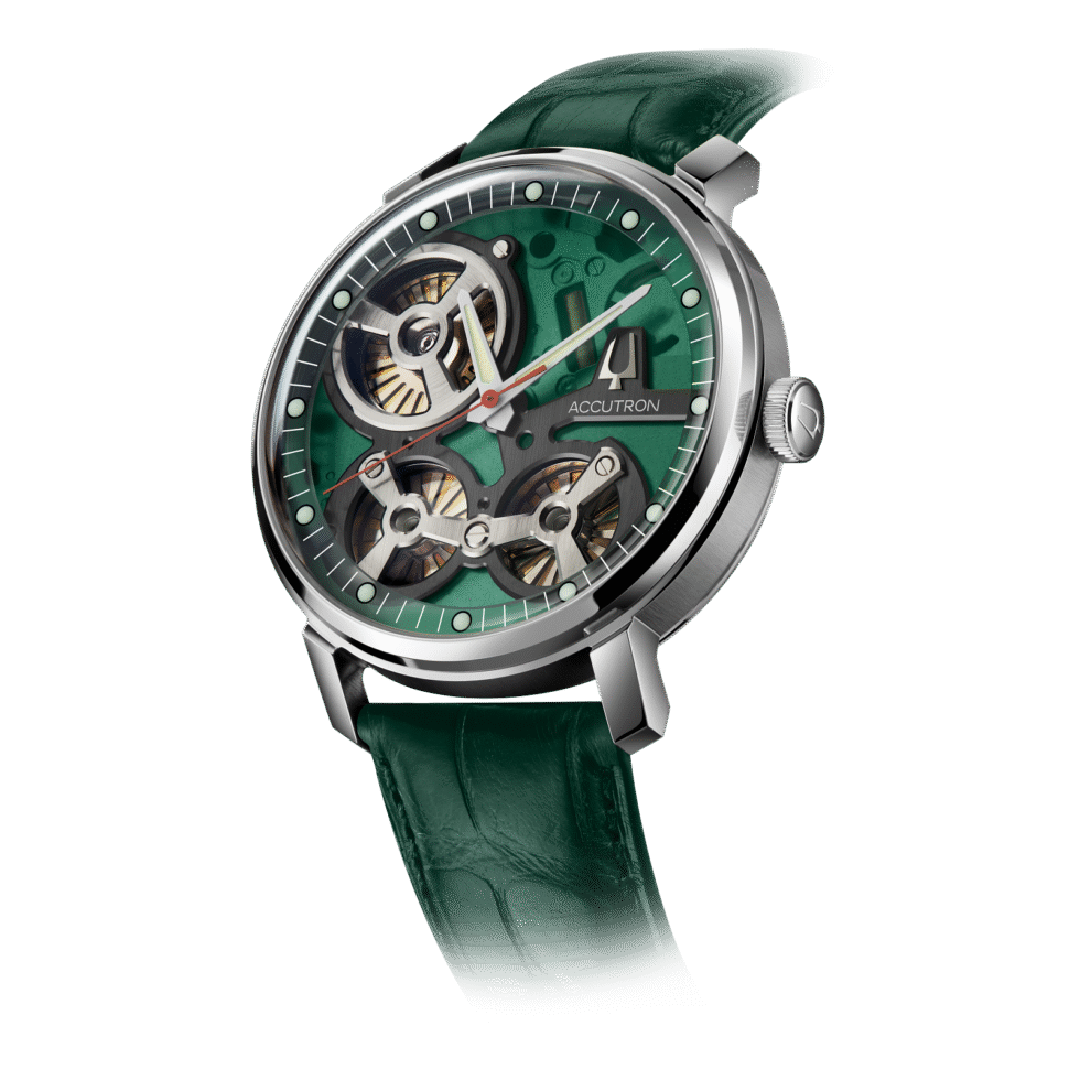 Accutron’s Proprietary Electrostatic Movement. The electrostatic energy is created by twin turbines that rotate as a result of human motion at incredible speeds between two electrodes affixed to the movement. The energy, stored in an accumulator, powers two motors; a world’s first electrostatic motor fueling the fluid second hand and a step motor powering the hour and minute hands.