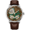 Brown open-work dial with signature Accutron green accents and brown outer ring. Light green super luminous markers, white hour and minute hands and warm yellow second hand.