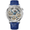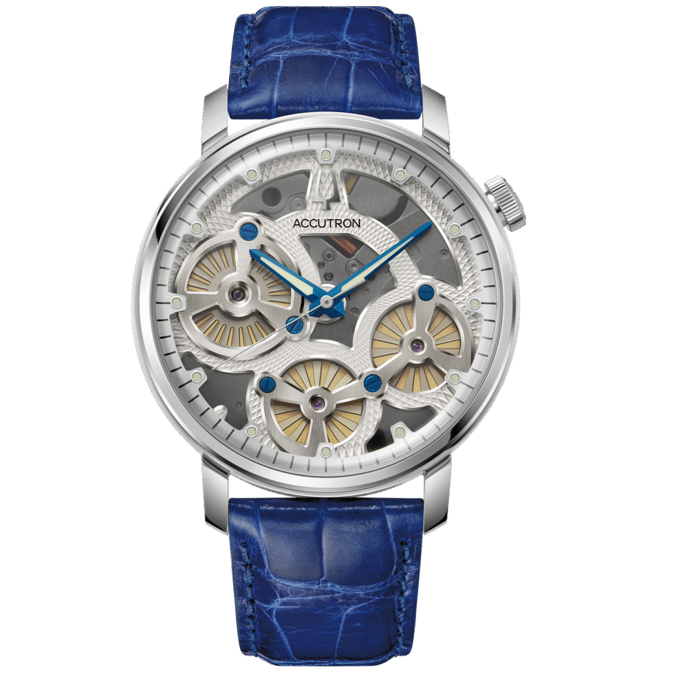 Featuring our proprietary Accutron movement powered by electrostatic energy – a historical advancement in timekeeping and the first of its kind -, the new Spaceview Evolution collection is a true design evolution of the original Spaceview 2020. While utilizing the same iconic and distinctive case of the Spaceview 2020, the new Spaceview Evolution features an updated orientation of the movement by 30 degrees to give the watches an entirely new look – the turbines are tilted, and crown is positioned at two o’clock. New bridgework detail is also incorporated with fine knurled finishing along with blue and black contrast screws for a pop of color. This style features a smoke grey and silver-tone open-work dial with metal dial rings on which the light green super luminous markers are set, metallic blue hour and minute hands with super luminova center and silver tone second hand. It comes on a shiny blue genuine American alligator strap.